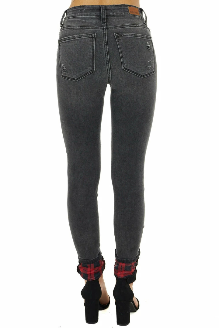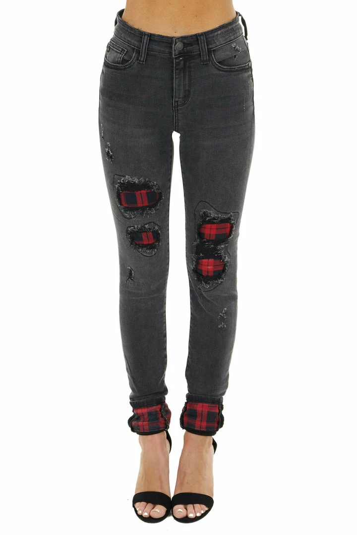 - Faded Black Mid Rise Jeans with Plaid Patches and Cuffs