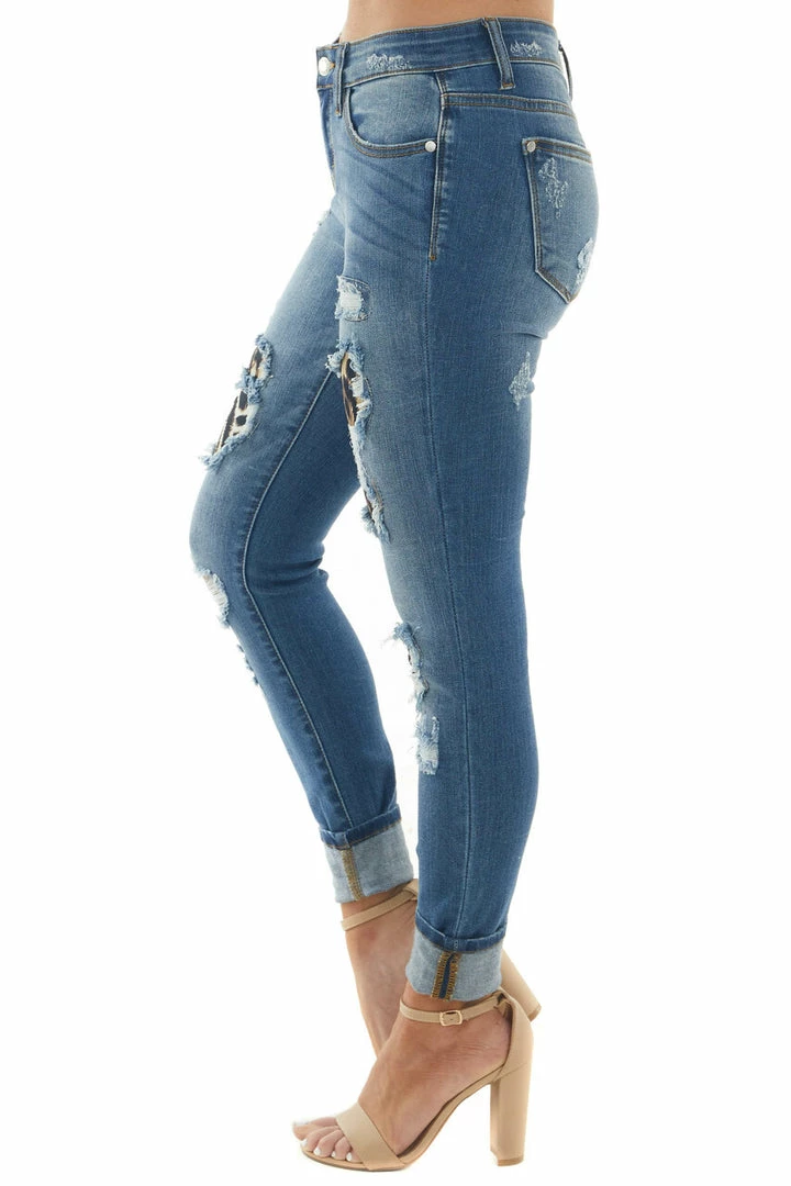 - Medium Wash Distressed Skinny Jeans with Leopard Print Patch