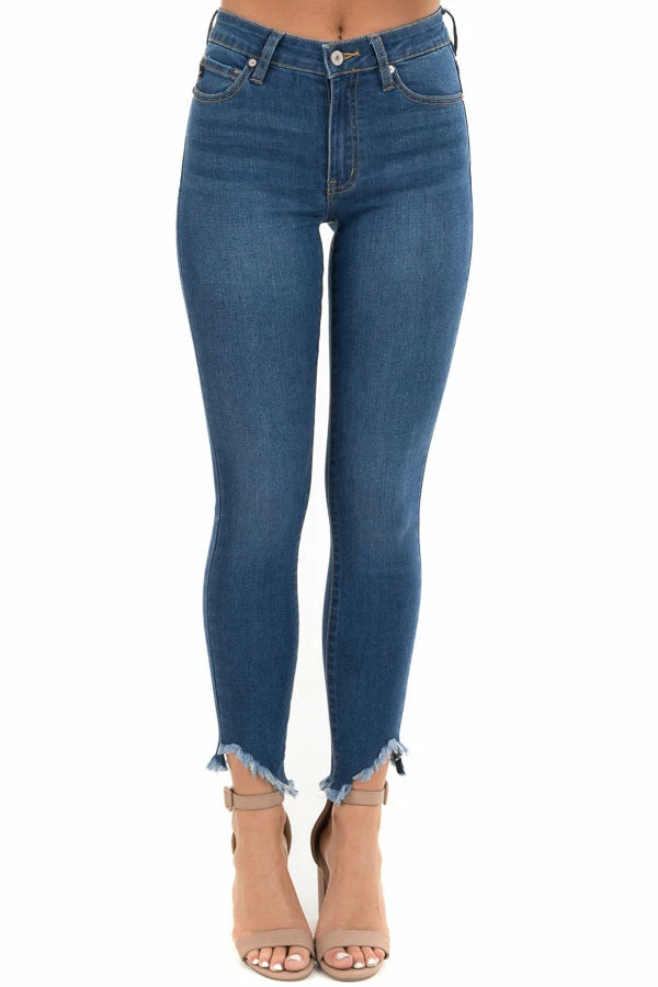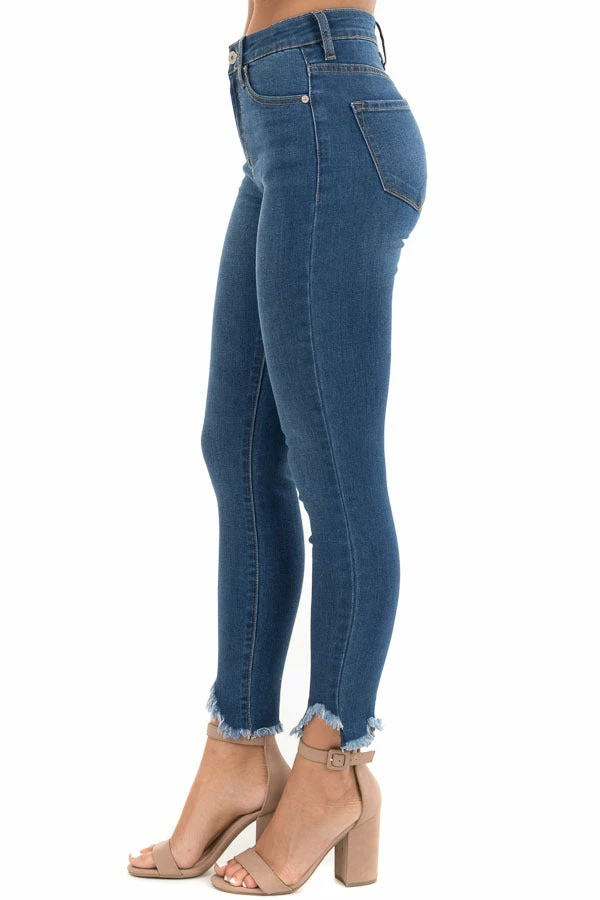 - Dark Wash High Waisted Ankle Skinny Jeans with Distressed Hem