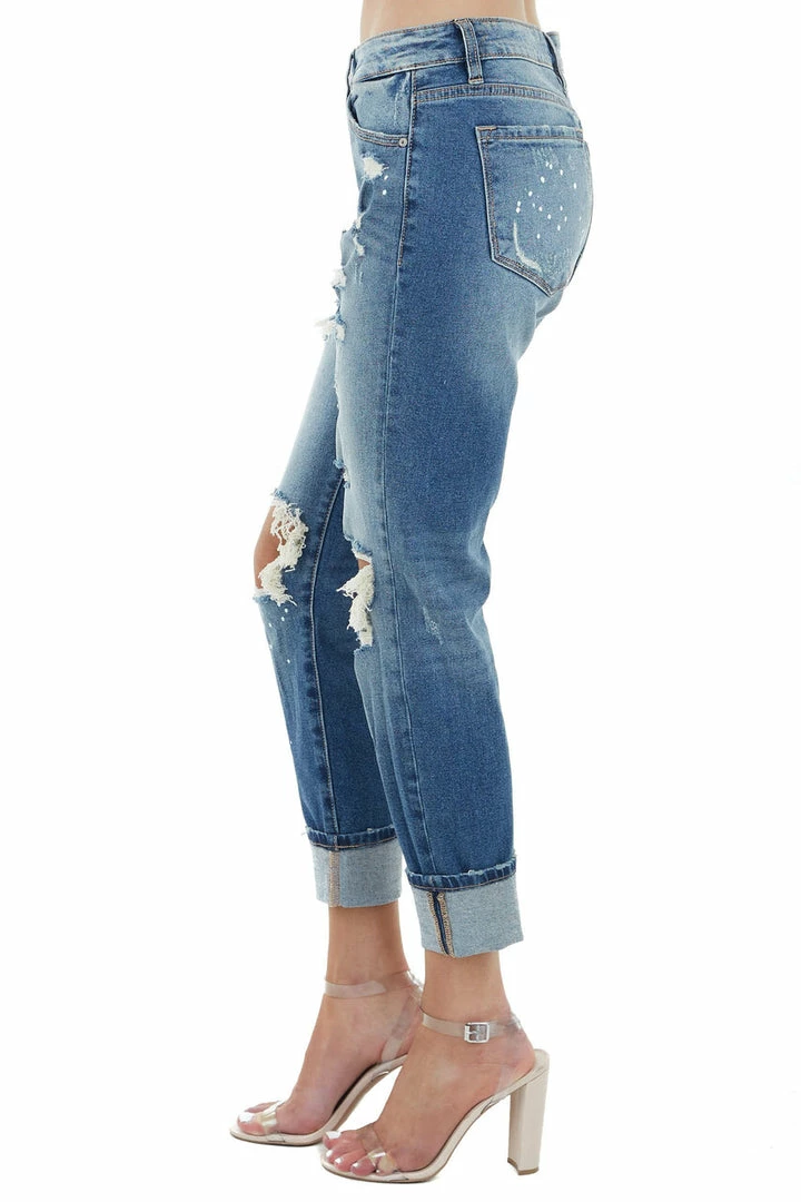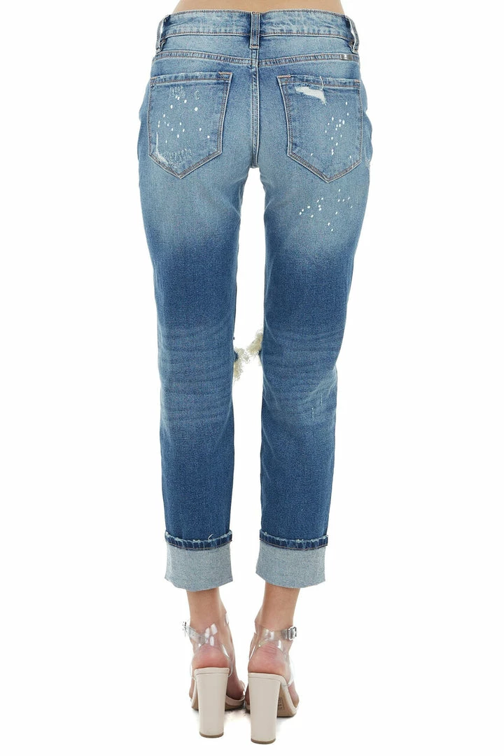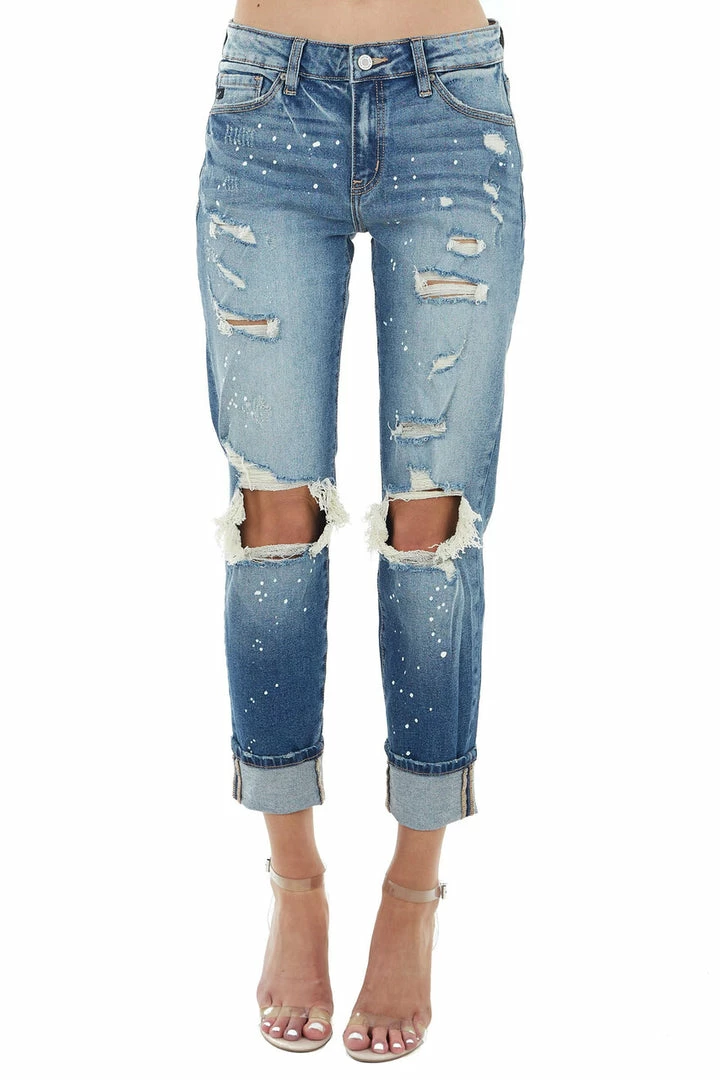 - Medium Wash Distressed Jeans with Paint Splatter Details