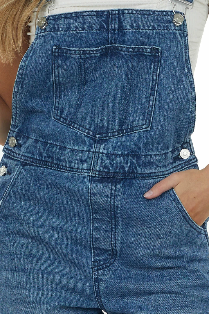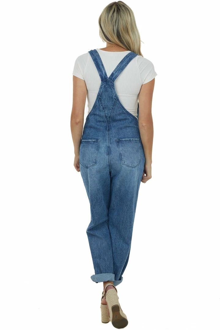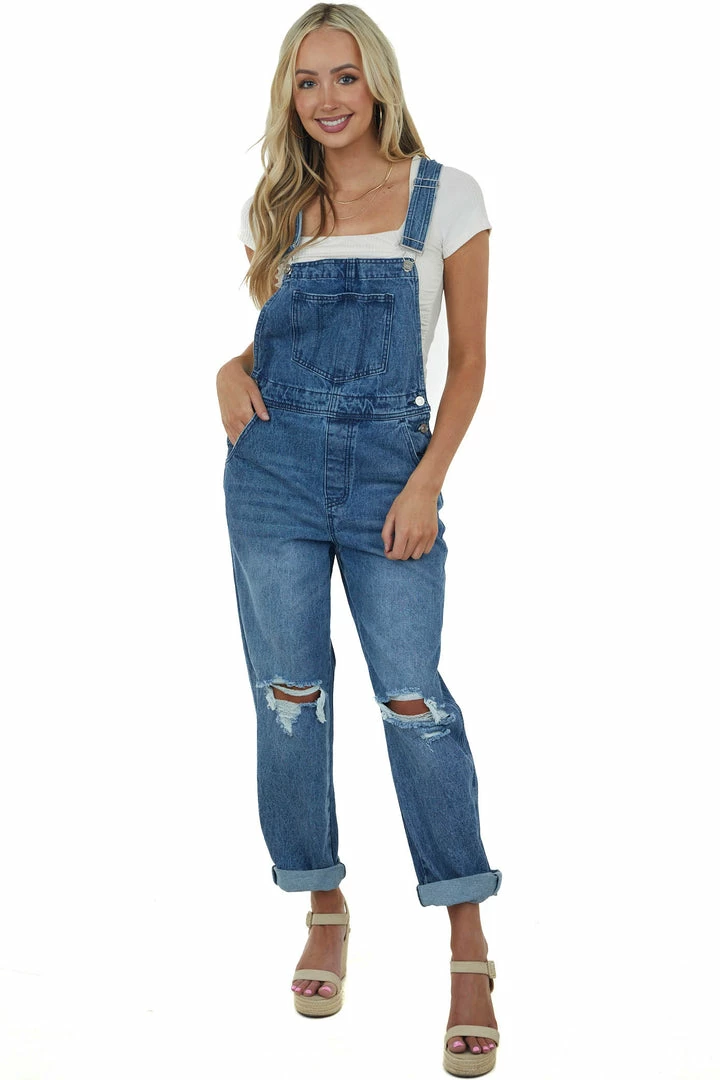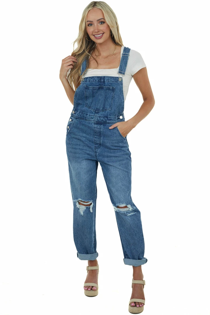 - Medium Wash Distressed Knee Wide Leg Denim Overalls
