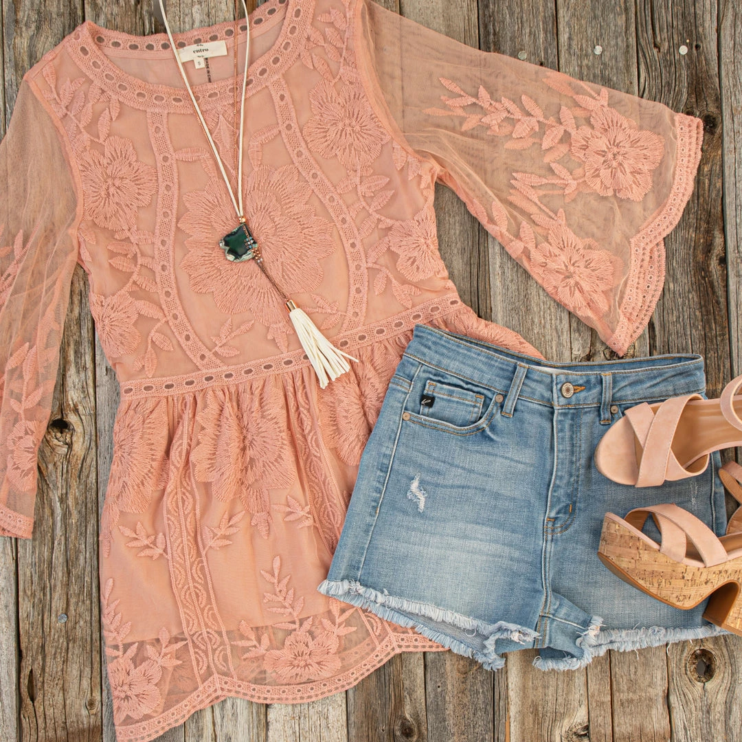- Medium Wash High Rise Denim Shorts with Frayed Detail