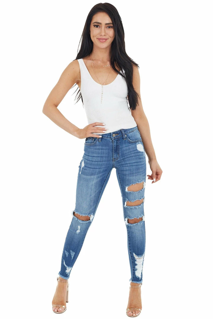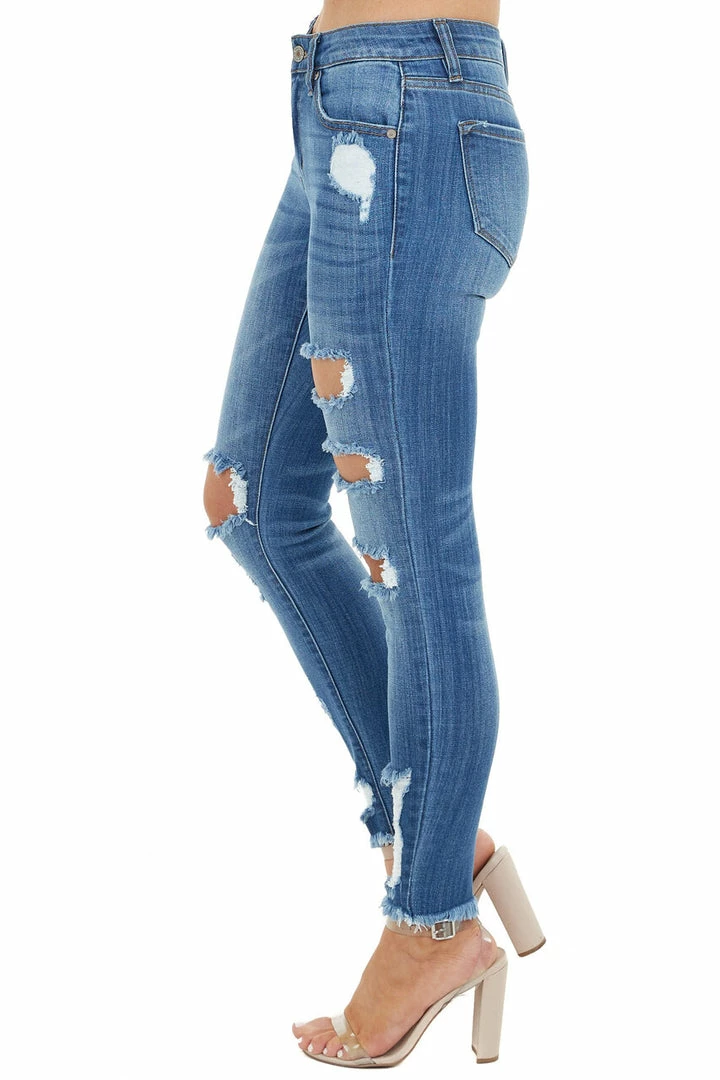 - Medium Wash Mid Rise Skinny Distressed Jeans with Frayed Hem