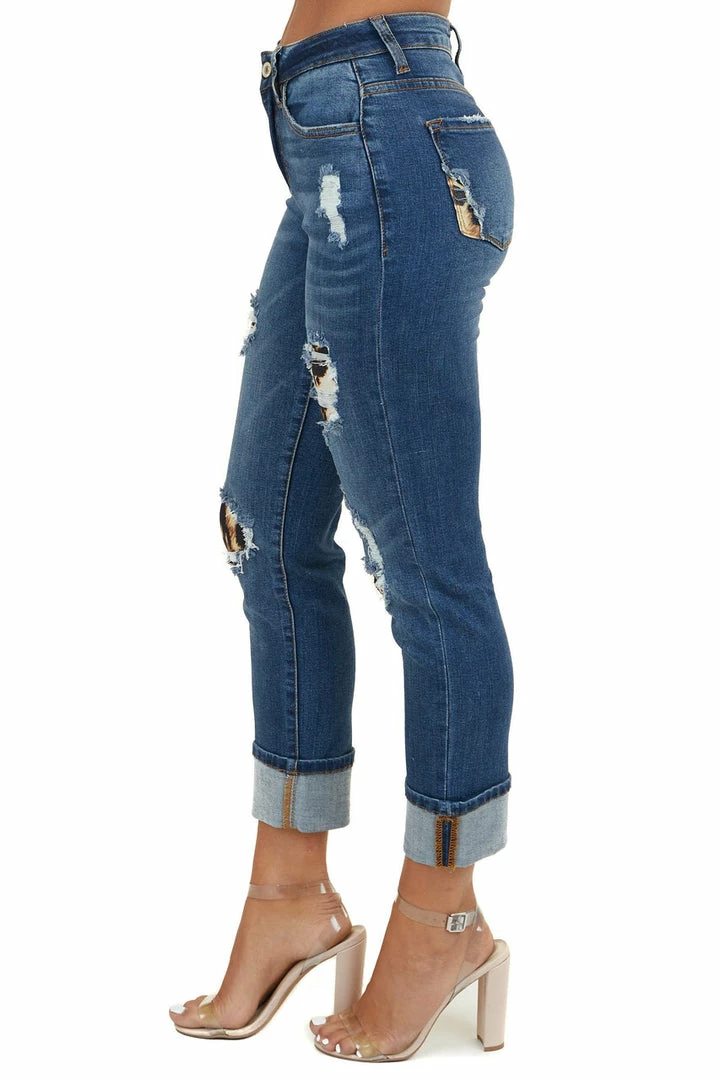 - Mid Wash Denim Blue Distressed Animal Print Straight Jeans
