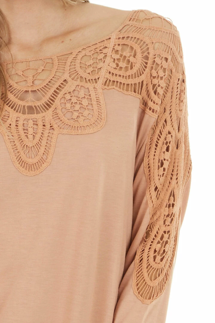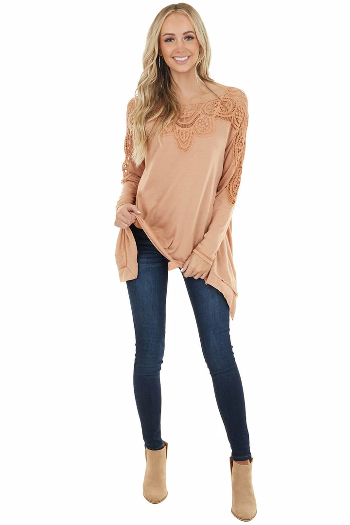 - Apricot Long Sleeve Knit Top with Crocheted Neckline