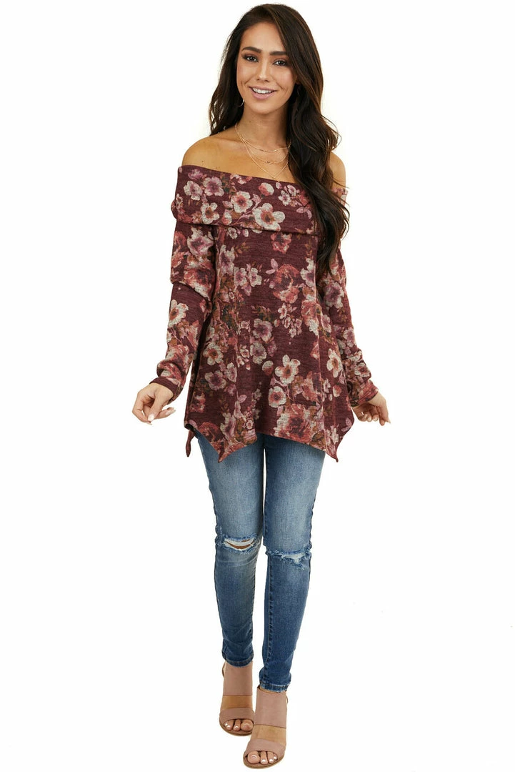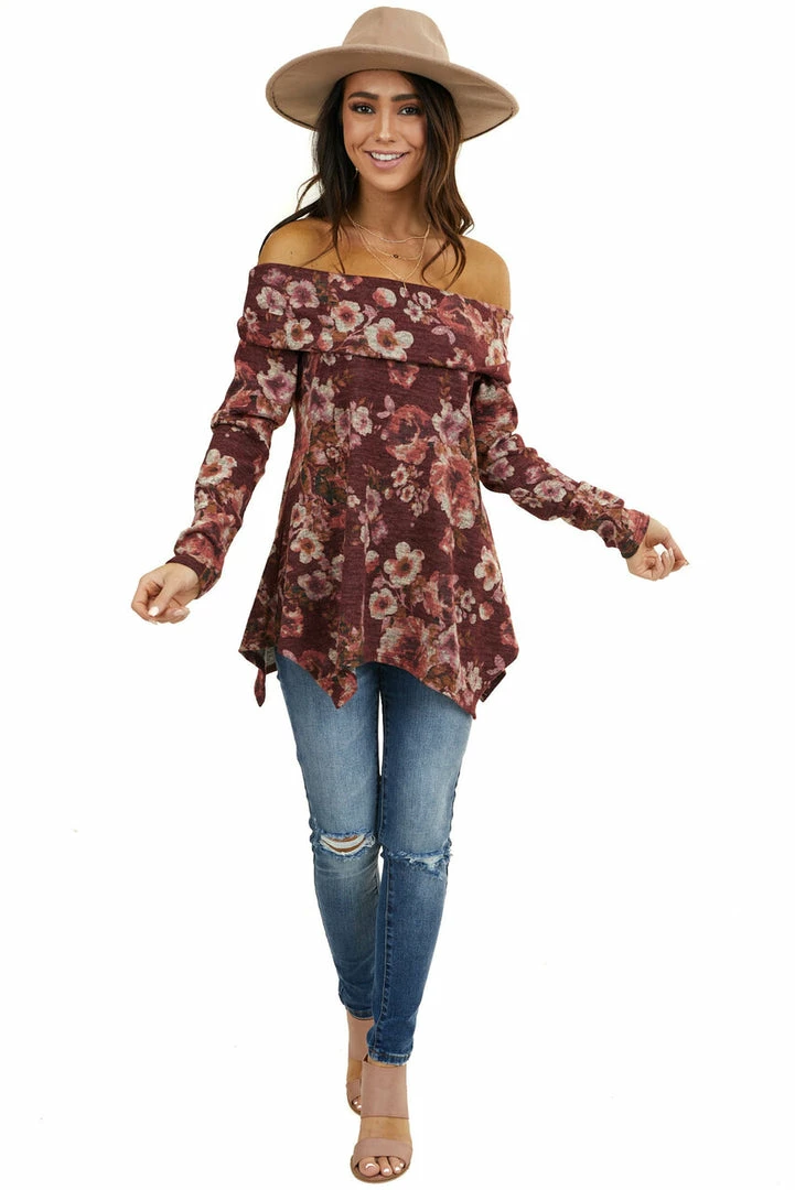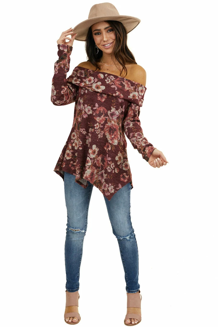 - Wine Floral Print Long Sleeve Top with Folded Off Shoulder