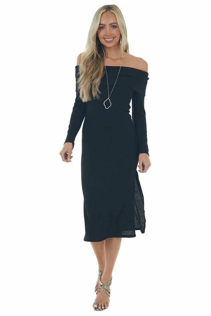 - Black Ribbed Off Shoulder Bodycon Midi Dress