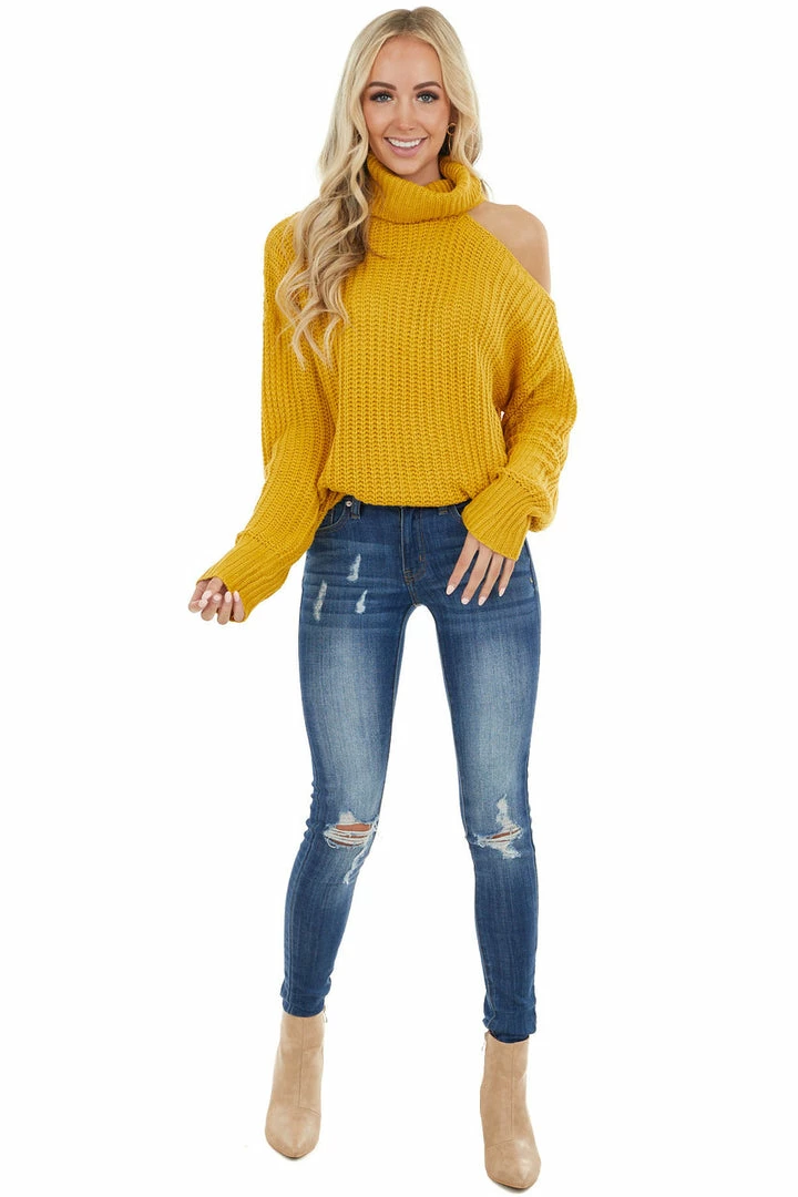 - Mustard Long Sleeve Knit Sweater with Cold Shoulder