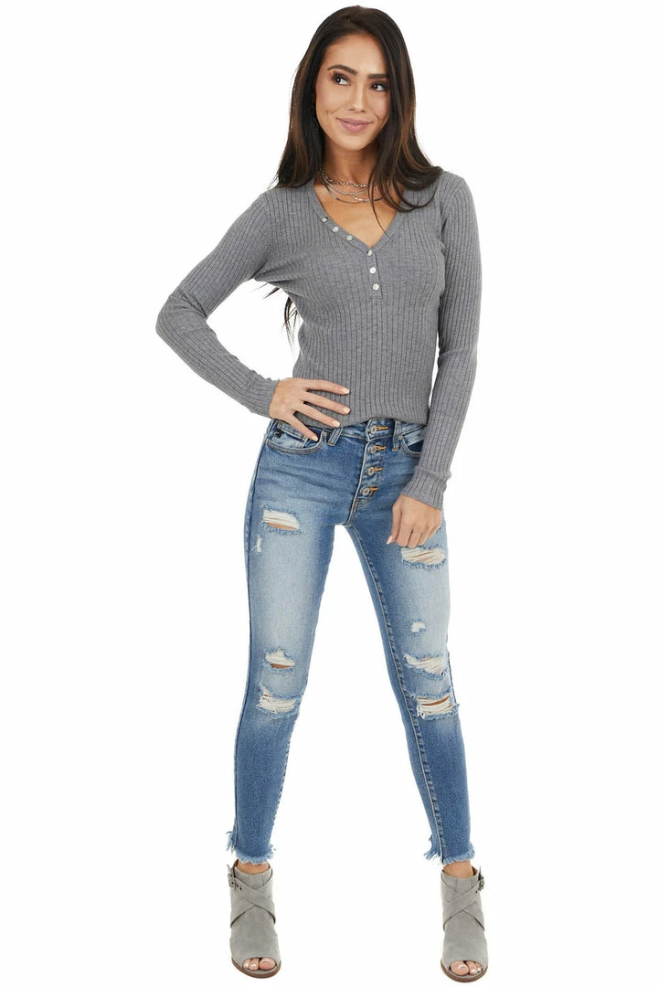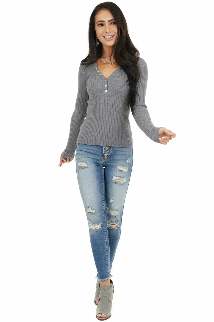 - Charcoal Rib Knit Henley Long Sleeve V Neck Top
