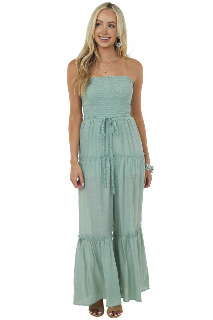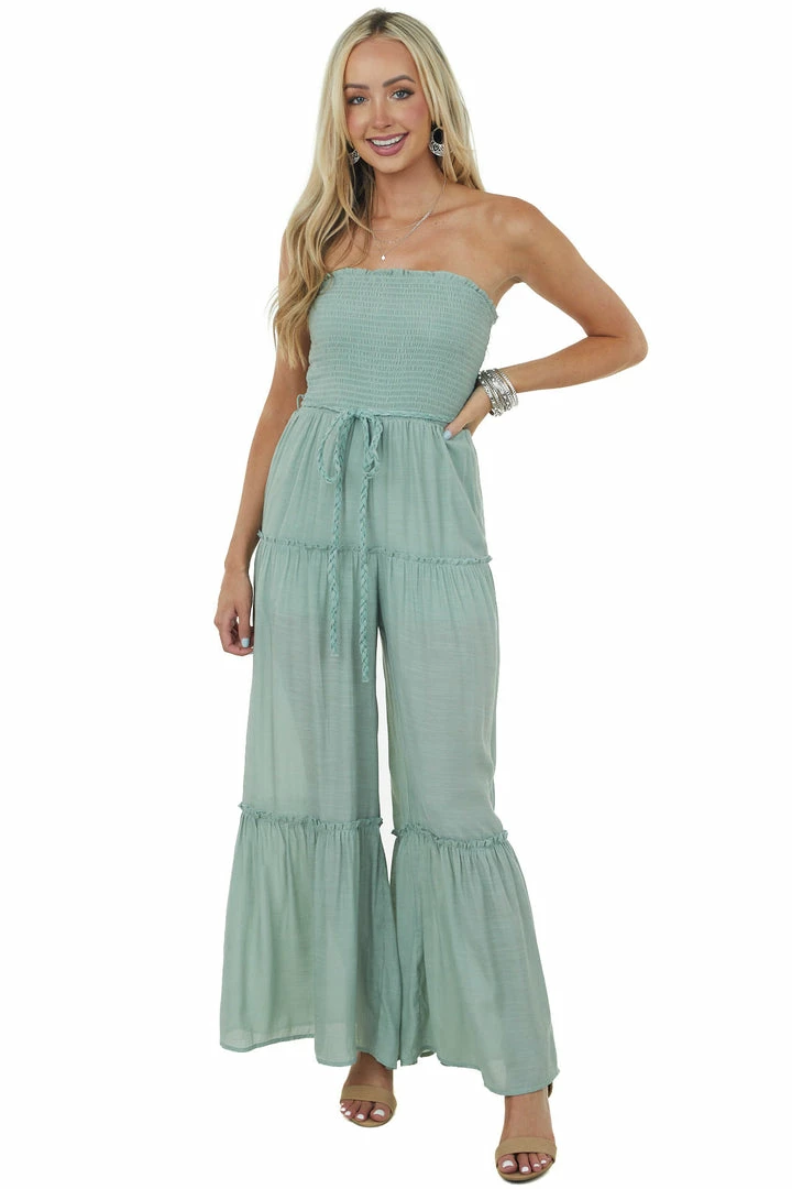 - Sage Strapless Smocked Jumpsuit with Tie Detail