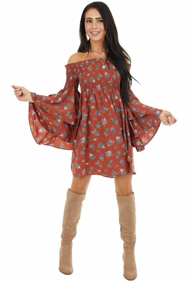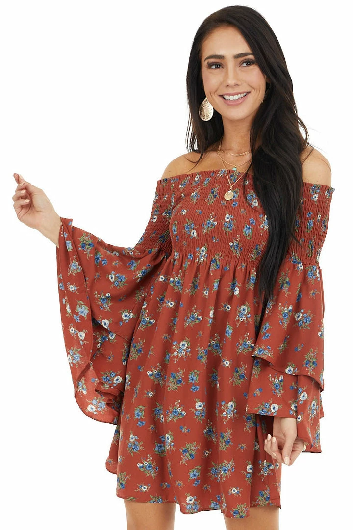 - Brick Red Floral Print Off the Shoulder Mini Dress