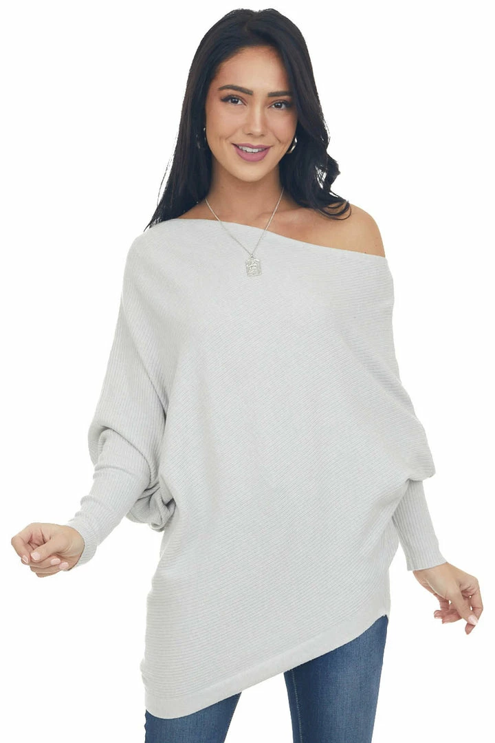 - Dove Grey Ribbed Knit Asymmetrical Off the Shoulder Top