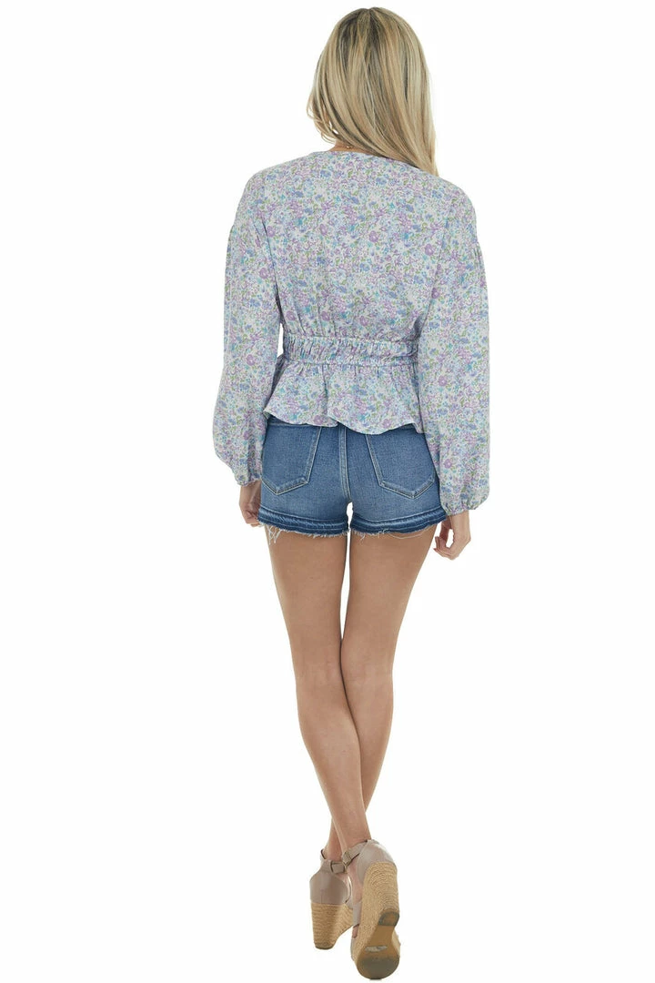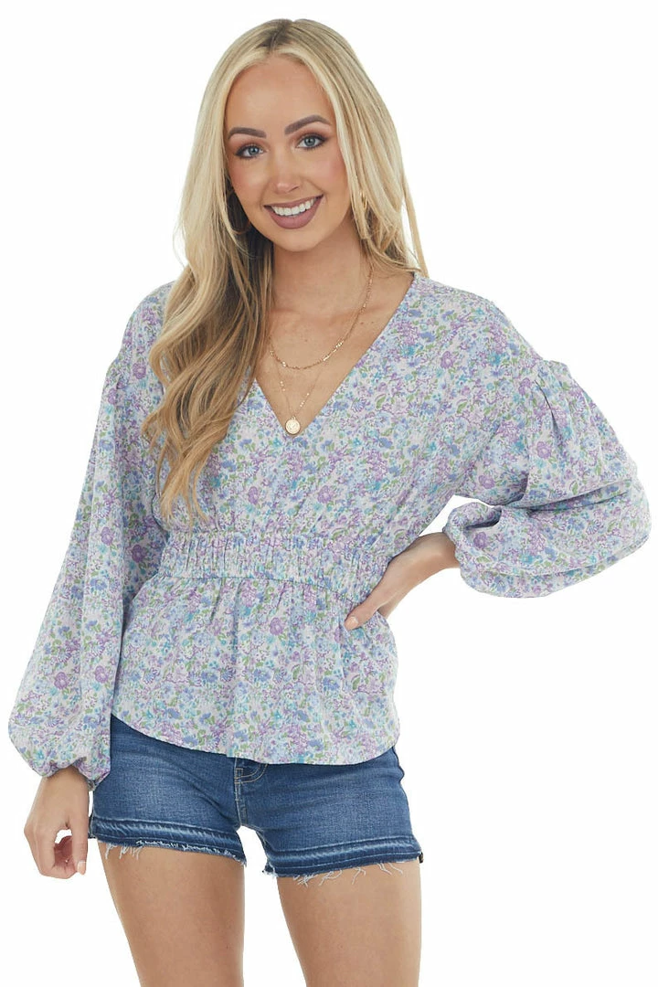 - Lilac Floral Smocked Waist V Neckline Top