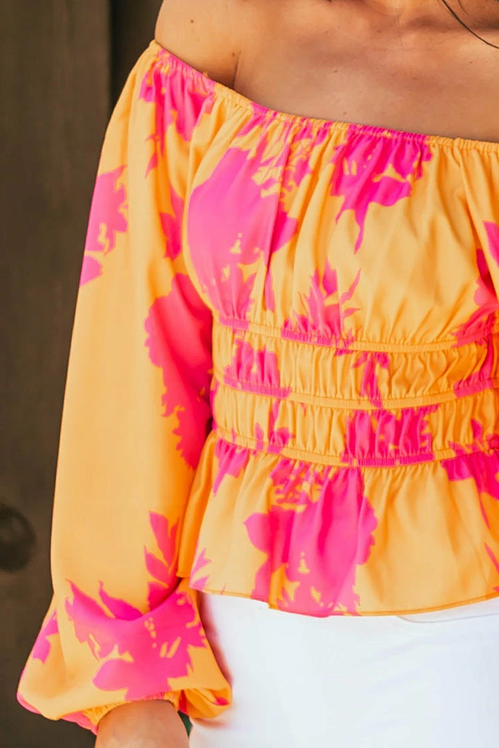 - Marigold Floral Print Off Shoulder Long Sleeve Top