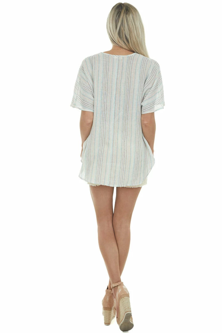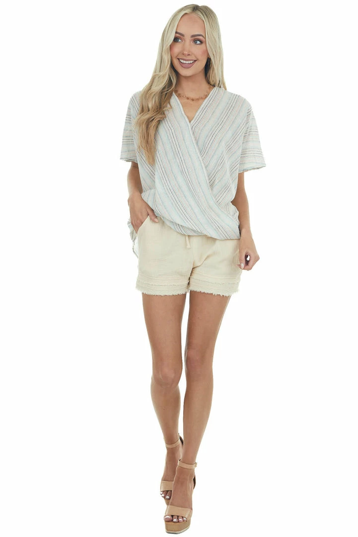 - Off White Multicolor Striped Surplice Top with Short Sleeves