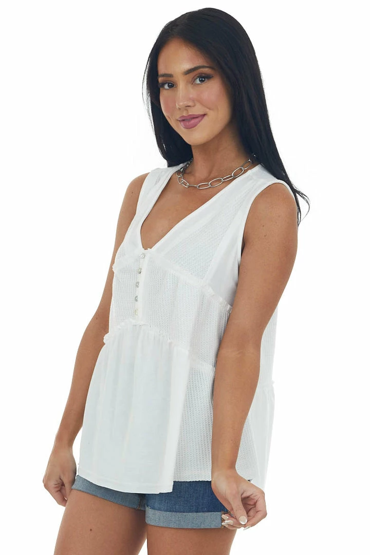 - Ivory V Neck Tank Top with Front Button Up Detail