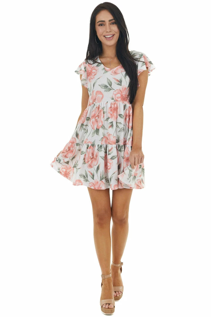- Off White and Punch Floral Print Tiered Ruffle Sleeve Dress