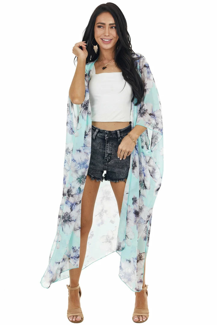 - Mint Floral Print Short Sleeve Kimono with Side Slits