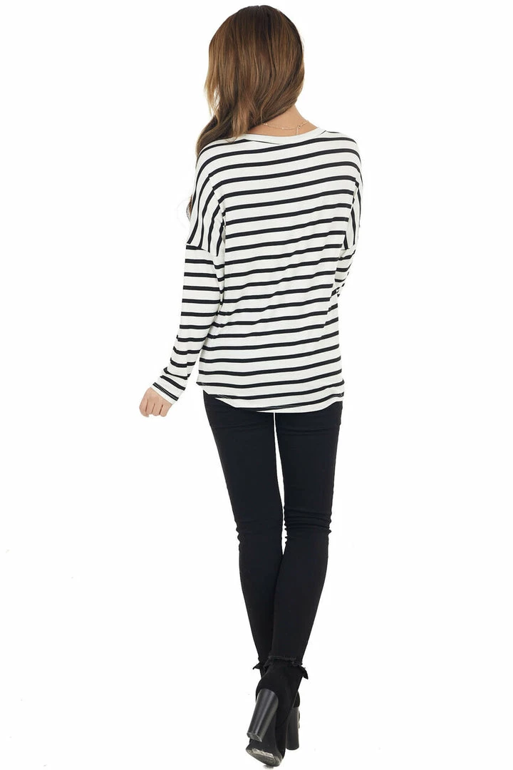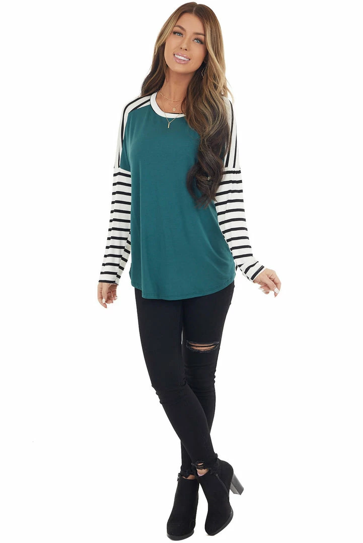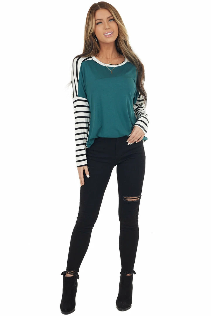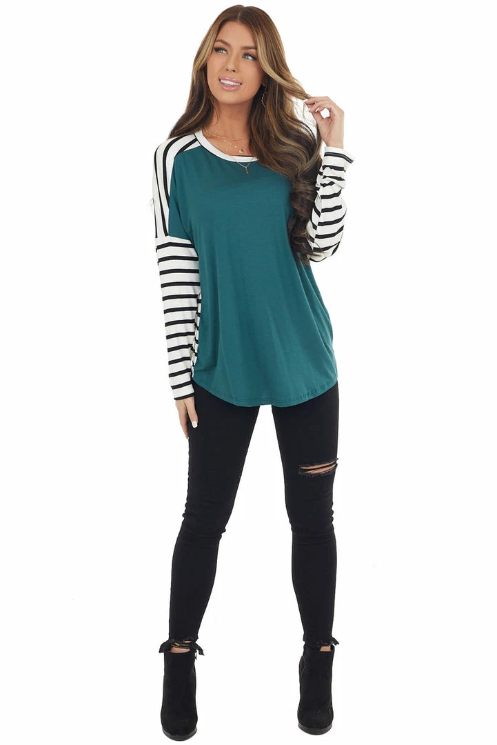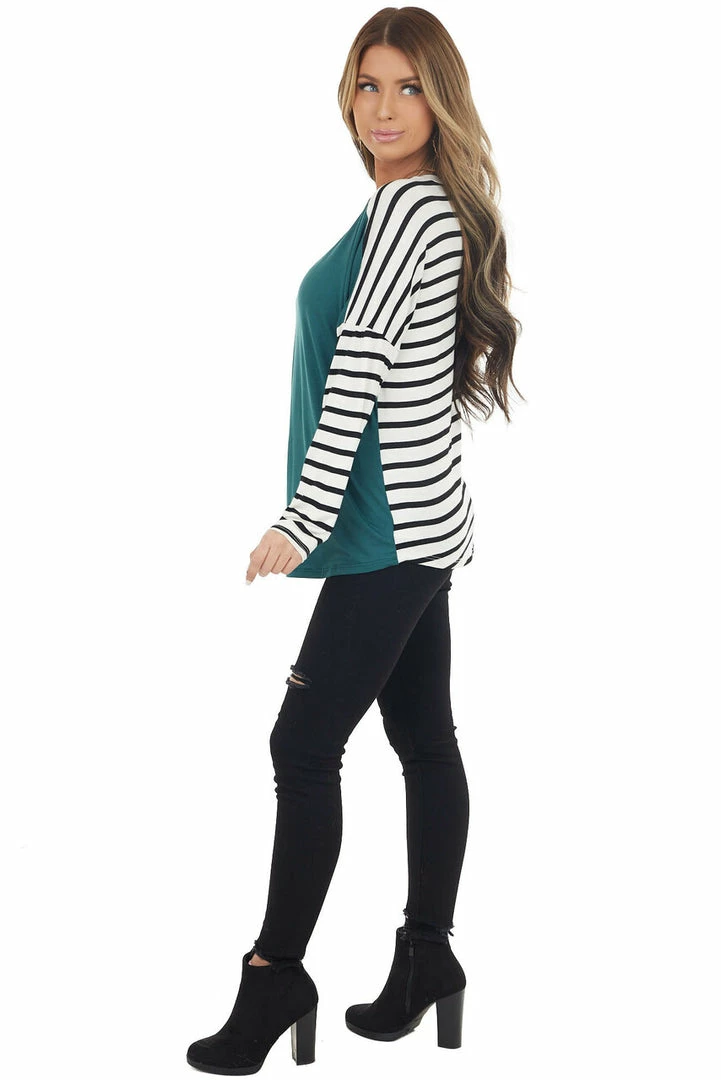 - Pine and Ivory Striped Long Sleeve Top with Solid Front
