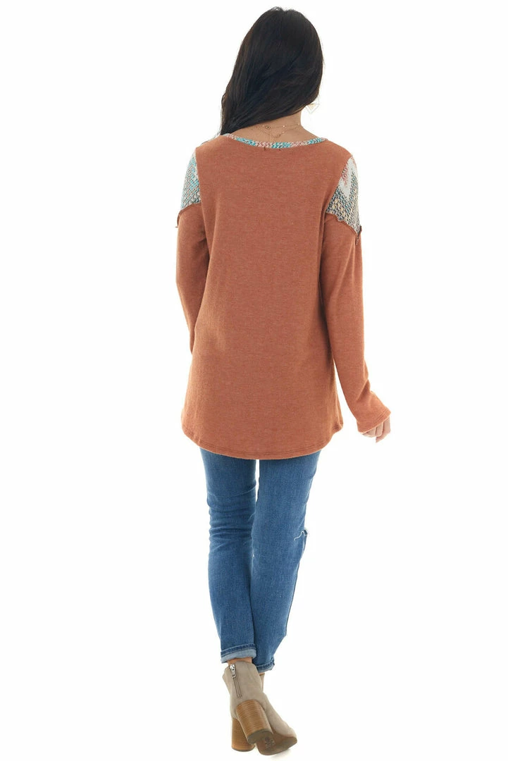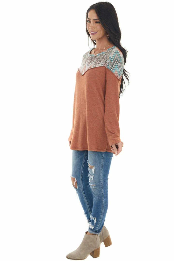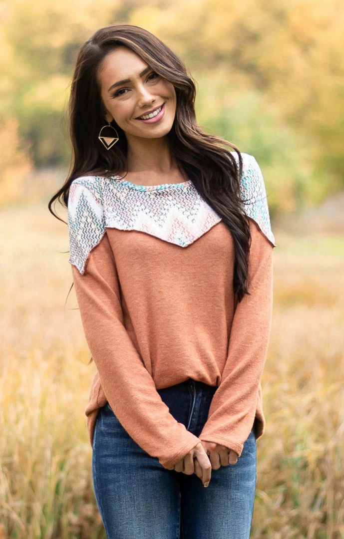 - Zigzag stripes in shades of Ginger, Salmon, Cinnamon, Rich Teal, and Amber