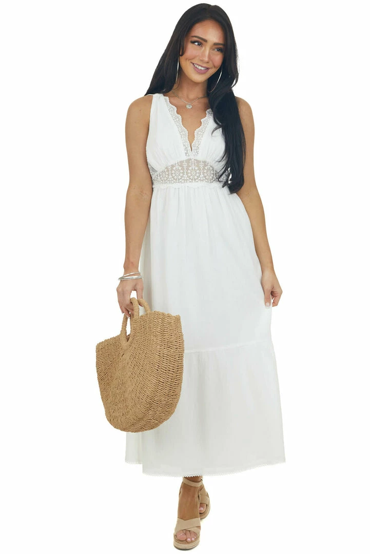 - Ivory Plunging Neck Lace Sleeveless Maxi Dress