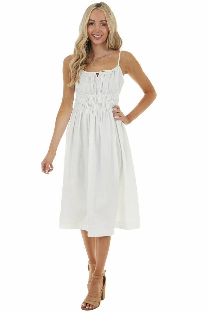 - Off White Sleeveless Midi Dress with Smocked Waistline