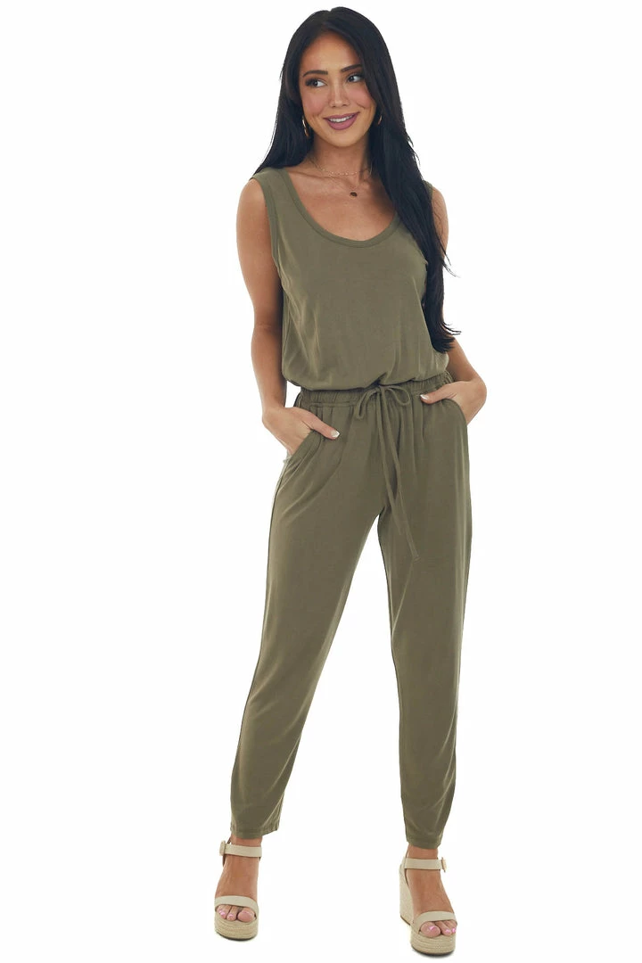 - Olive Sleeveless Stretchy Knit Jumpsuit with Waist Tie