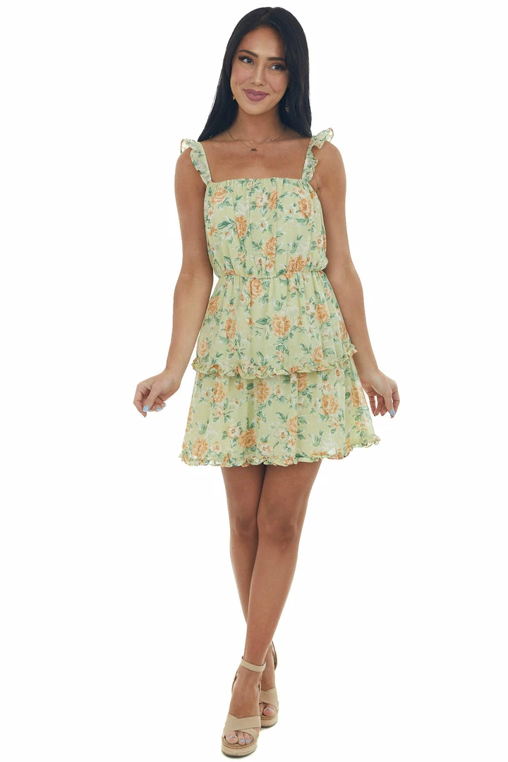 - Sage Floral Sleeveless Ruffle Dress