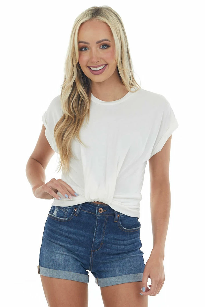 - Ivory Front Knot Short Sleeve Cropped Knit Top