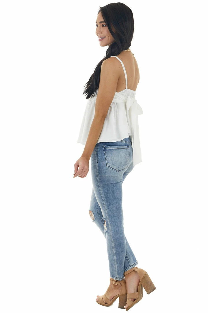 - Off White Textured Woven V Neck Cami with Back Tie Bow
