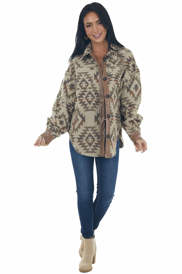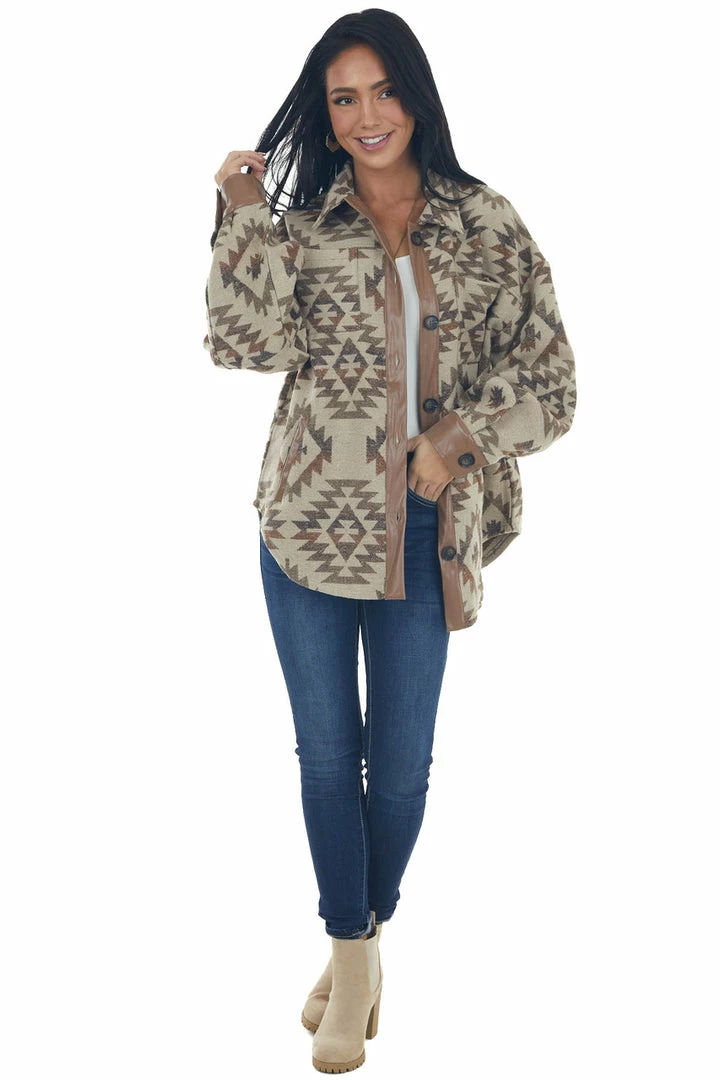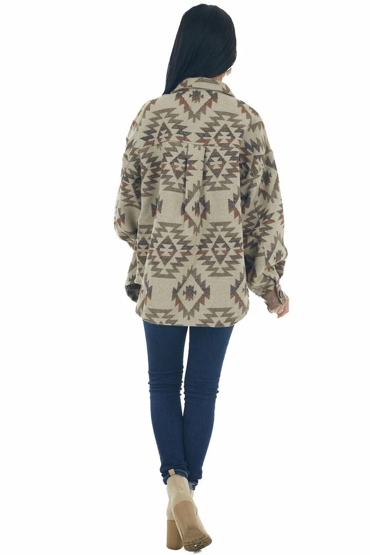 - Beige Aztec Print Button Up Shirt JacketNo lining