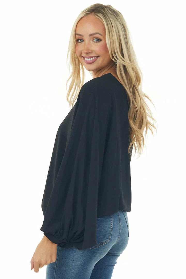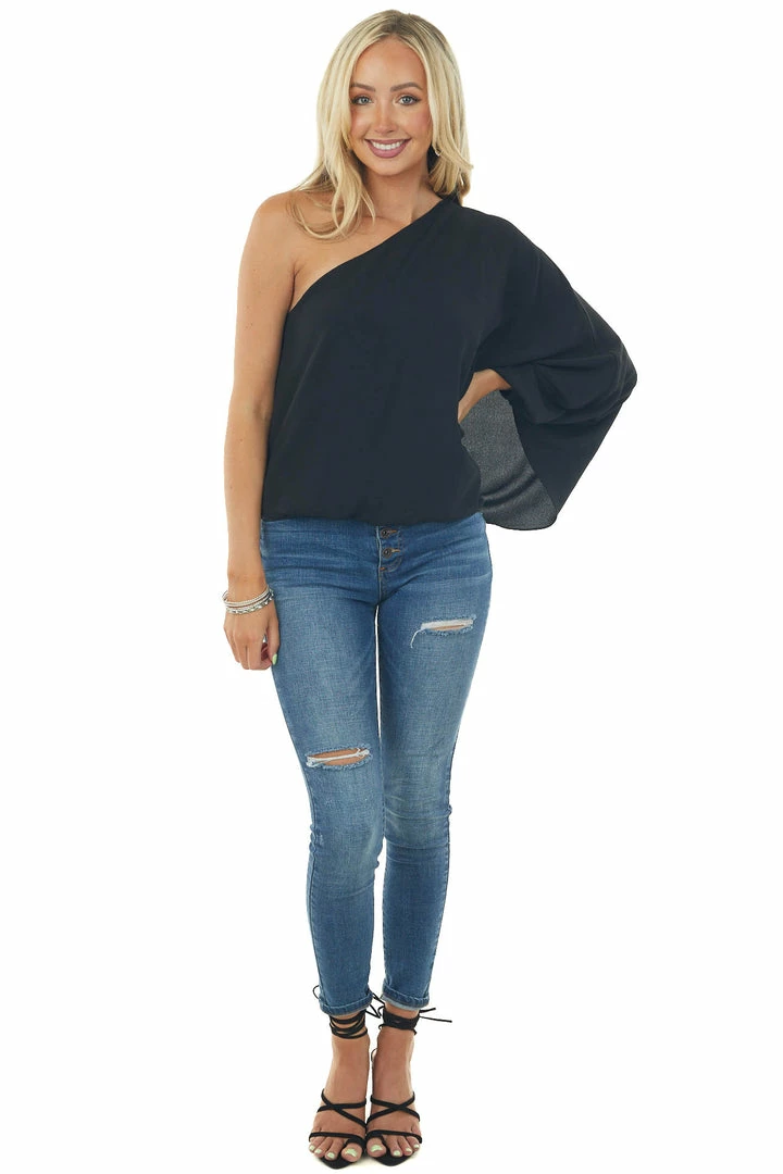 - Black One Shoulder Elastic Hem Flowy Blouse