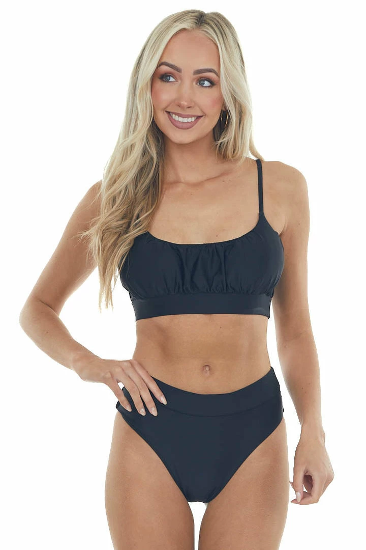 - Black Ruched Scoop Neck High Leg Bikini Set