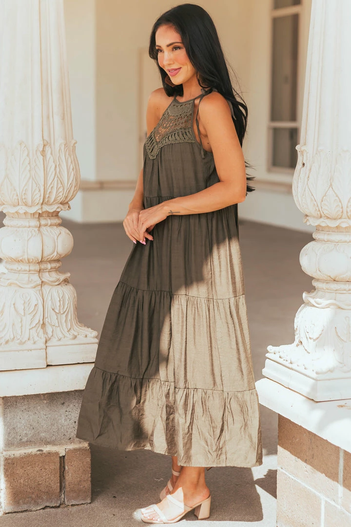 - Army Green Halter Neck Lace Yoke Woven Midi Dress