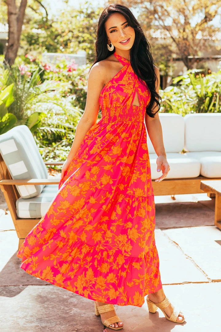 - Hot Pink Floral Print Halter Neck Tiered Maxi Dress