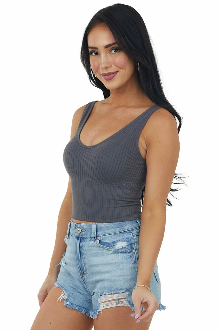 - Graphite Padded V Neck Ribbed Cropped Tank Top