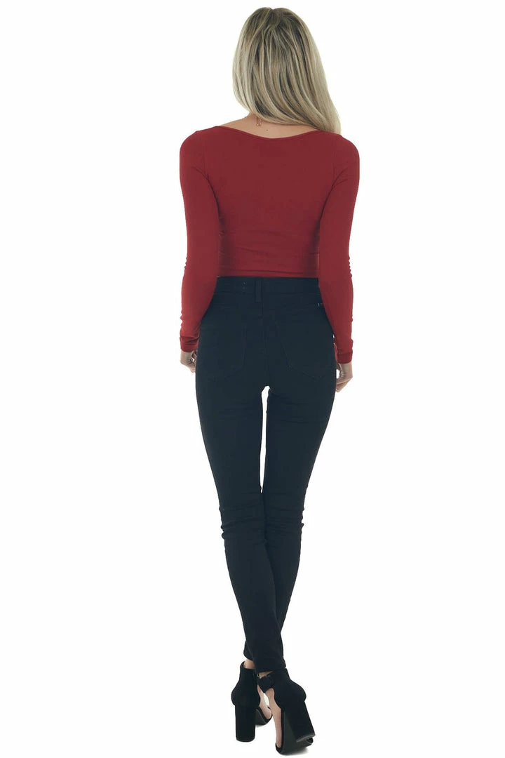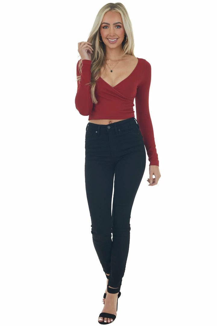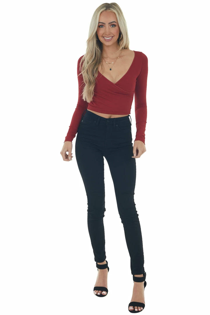 - Cranberry Ribbed Long Sleeve Surplice Crop Top