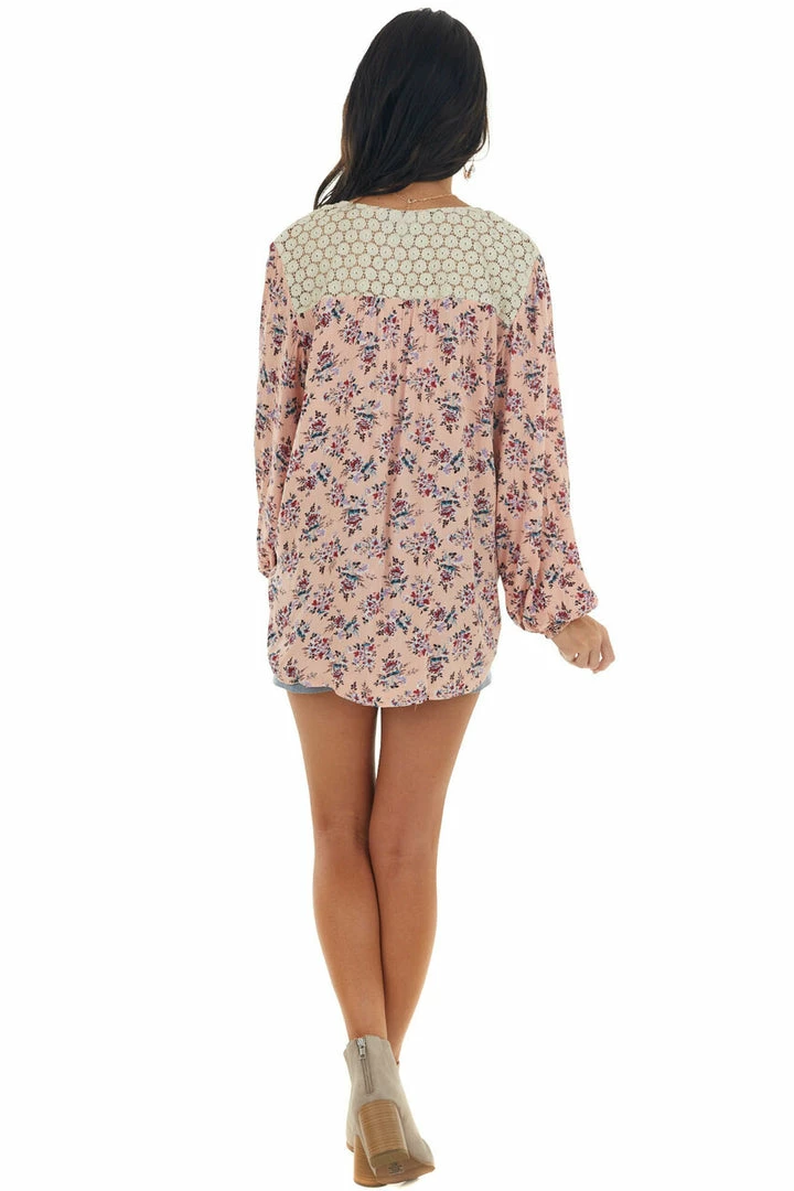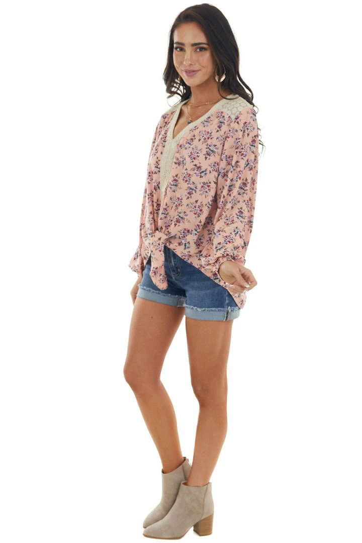 - Pale Coral Long Sleeve Floral Front Tie Blouse