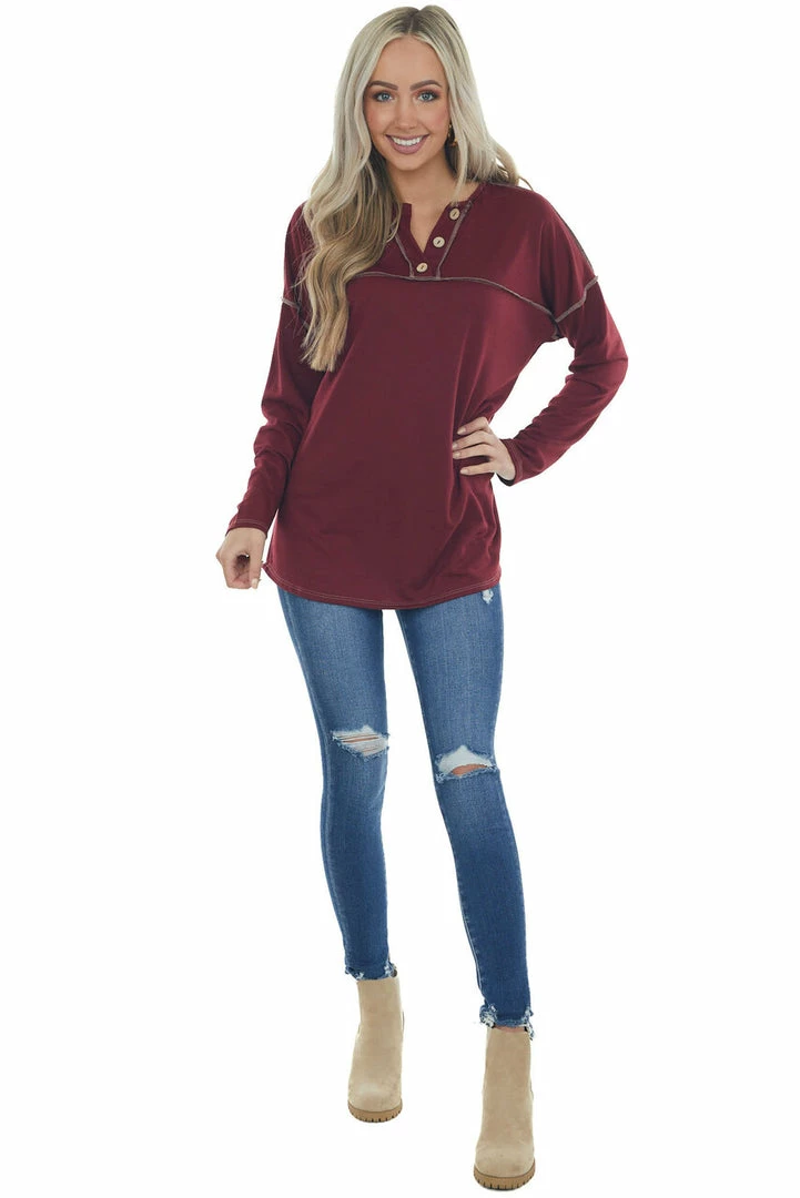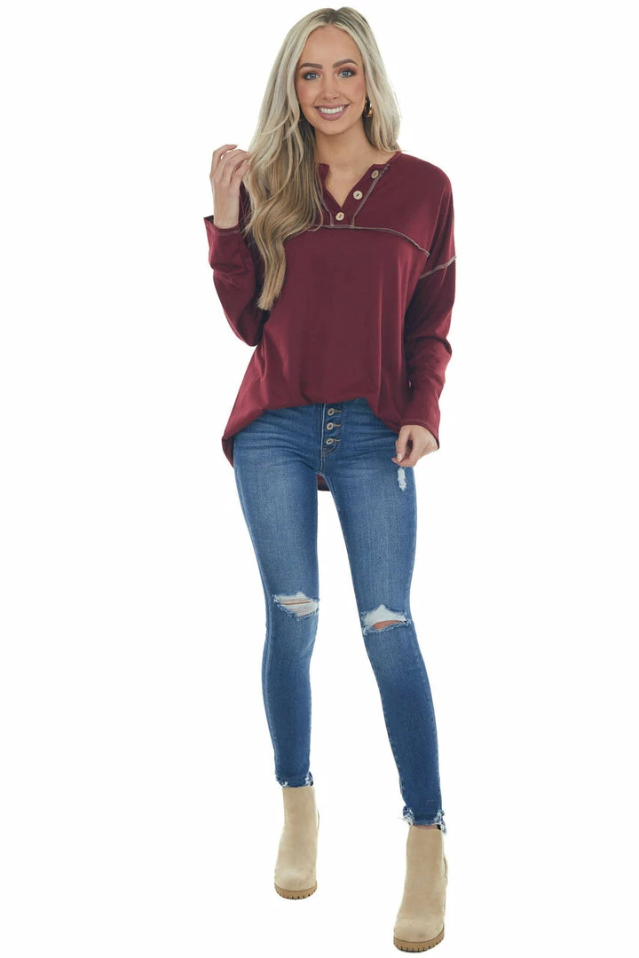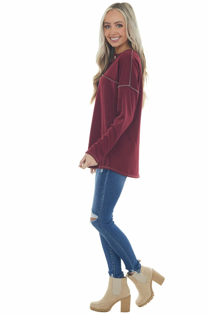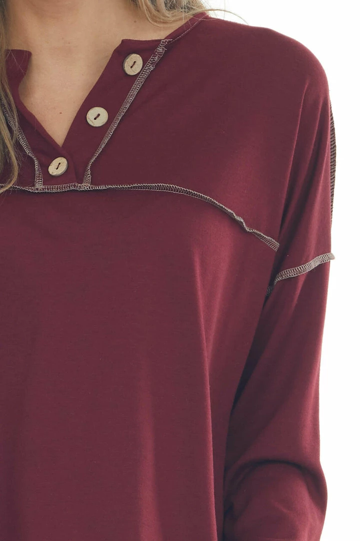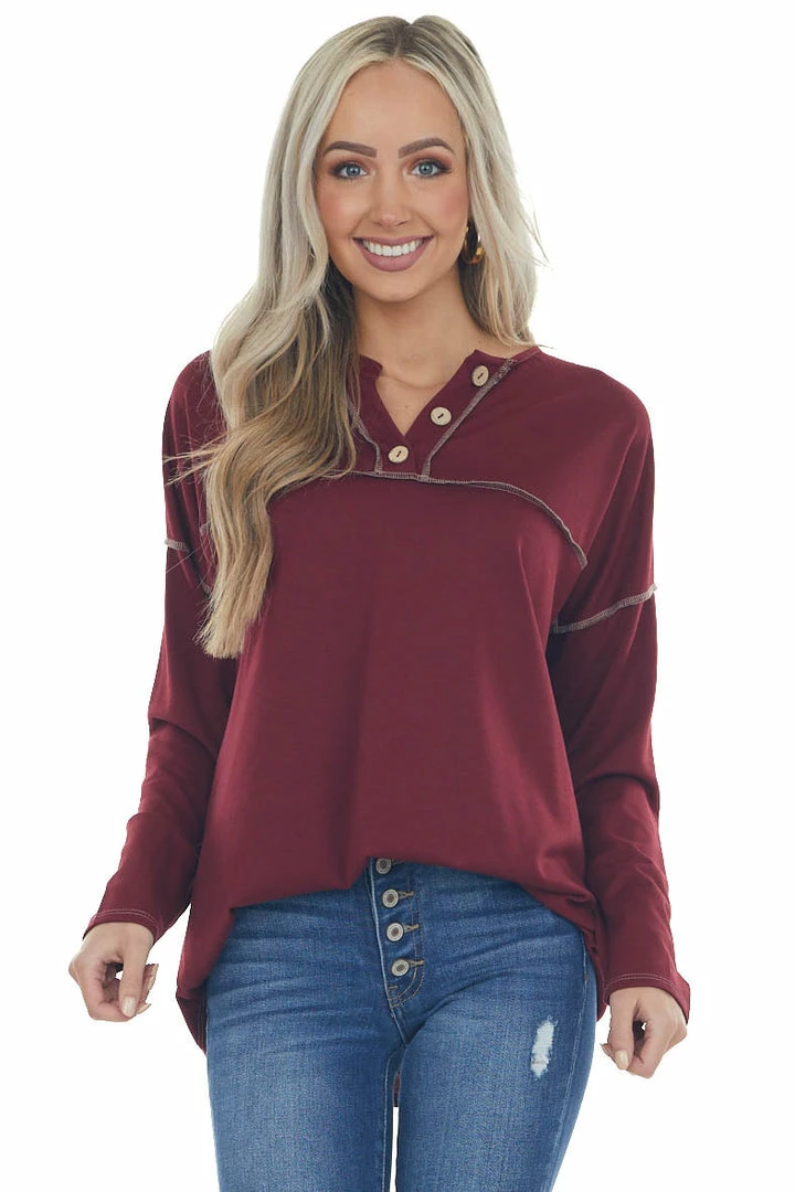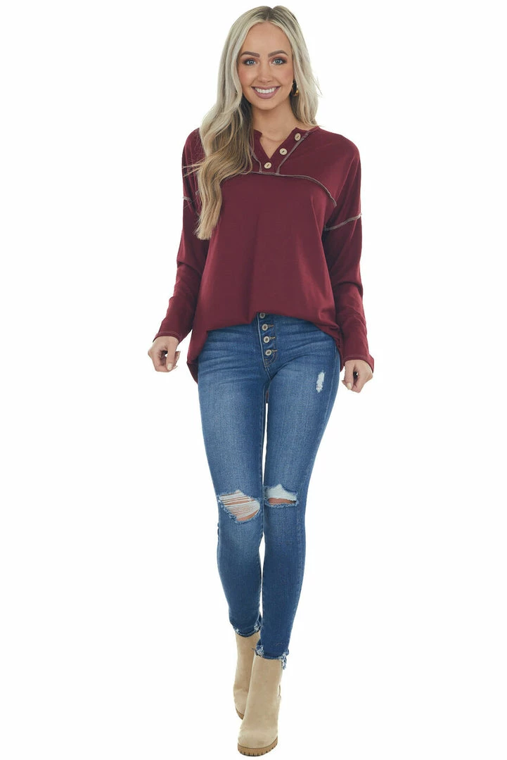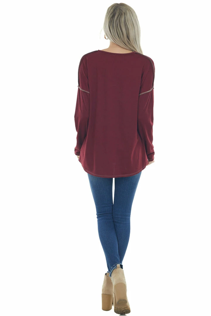 - Burgundy Soft Knit V Neck Exposed Seam Top
