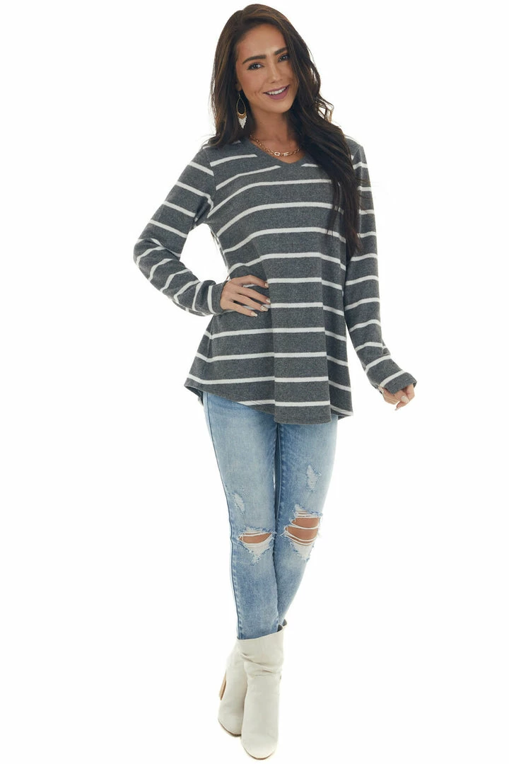 - Graphite Striped Brushed Knit V Neckline Top