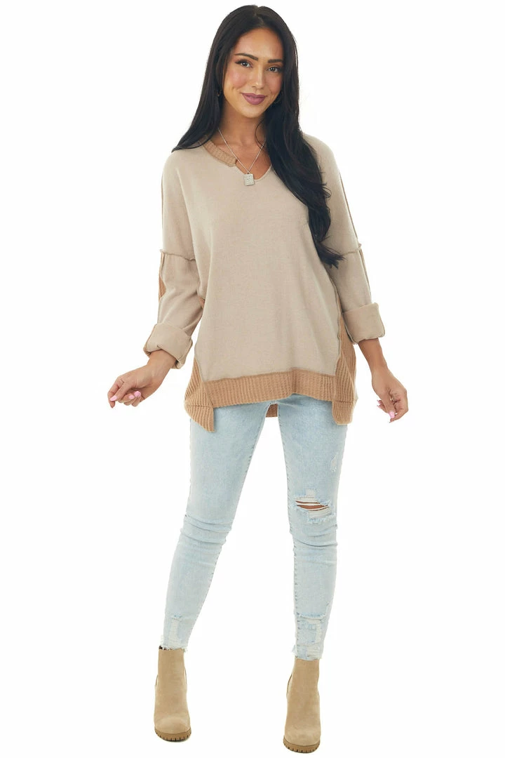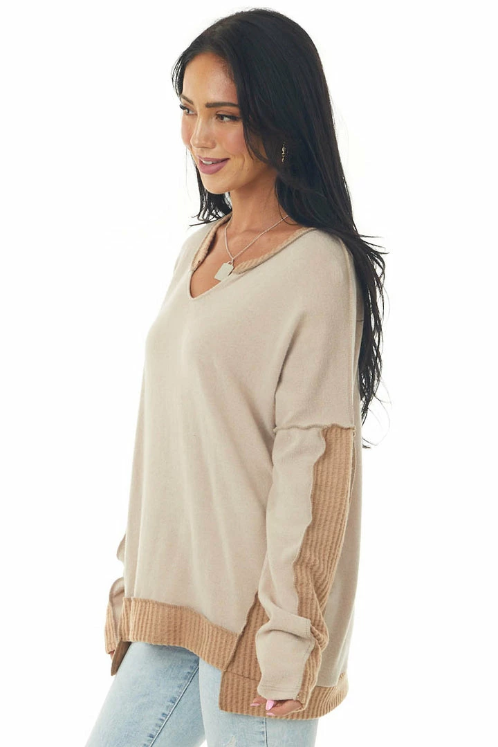 - Taupe Brushed Knit Top with Peach Contrast