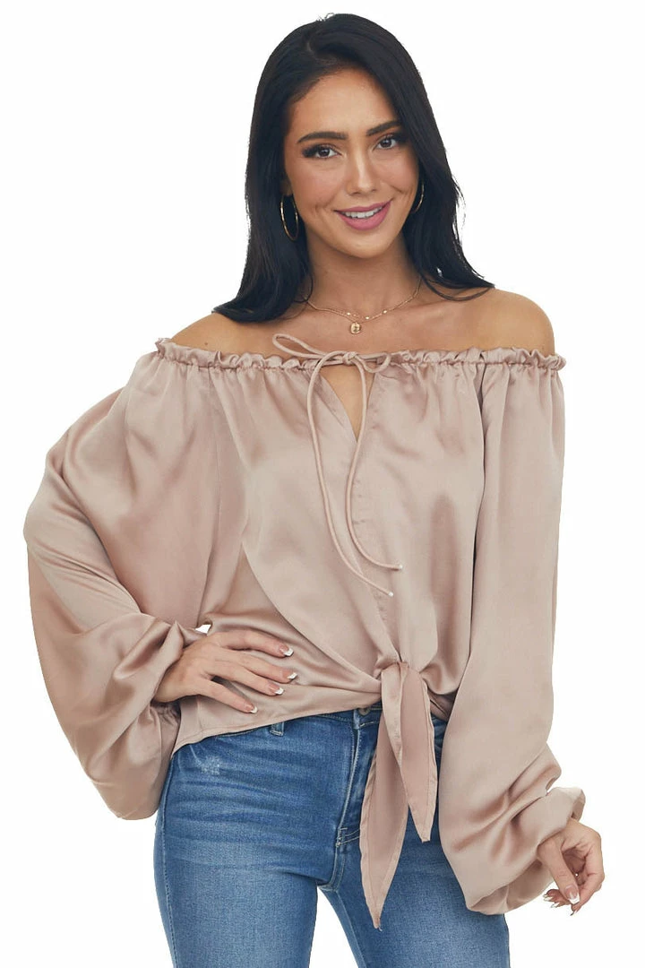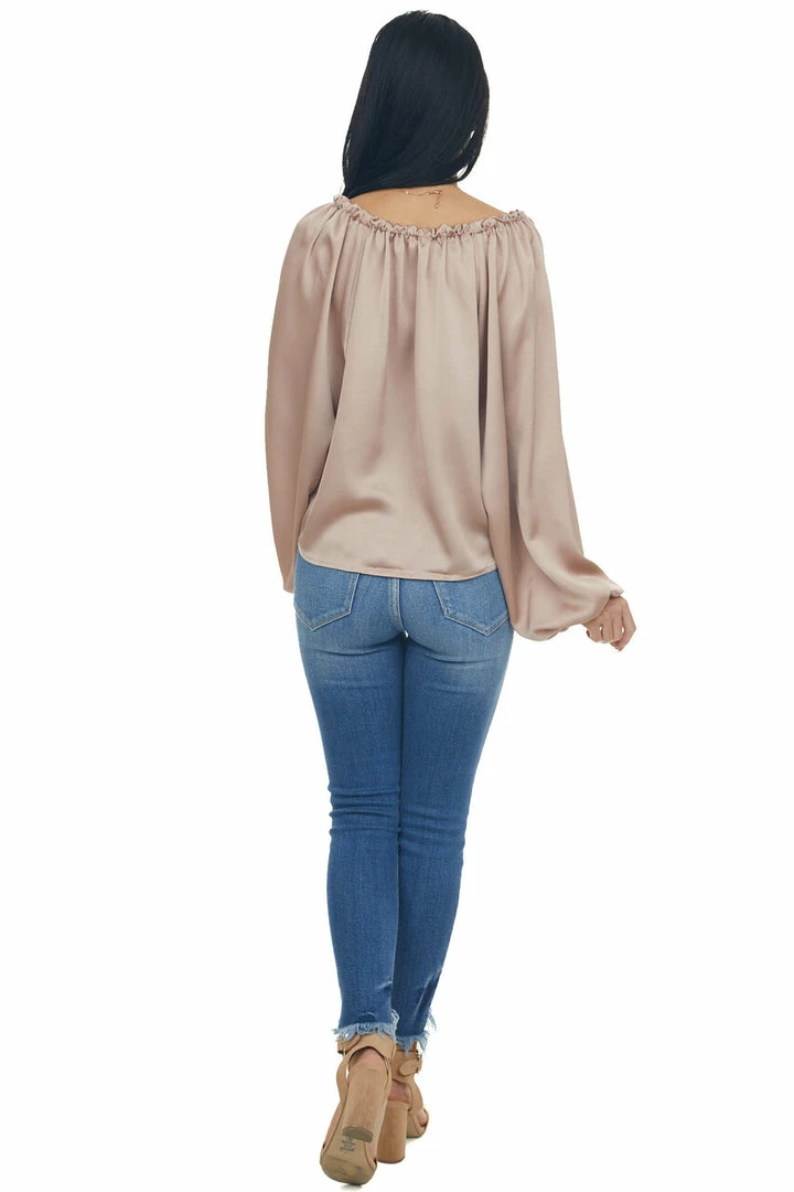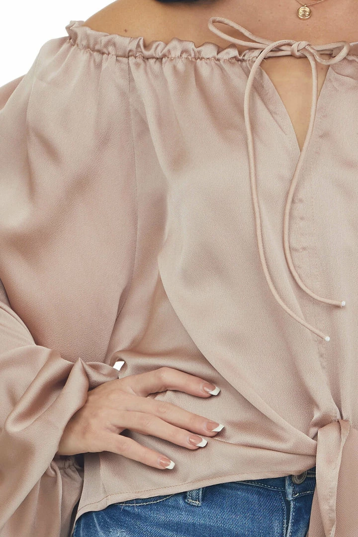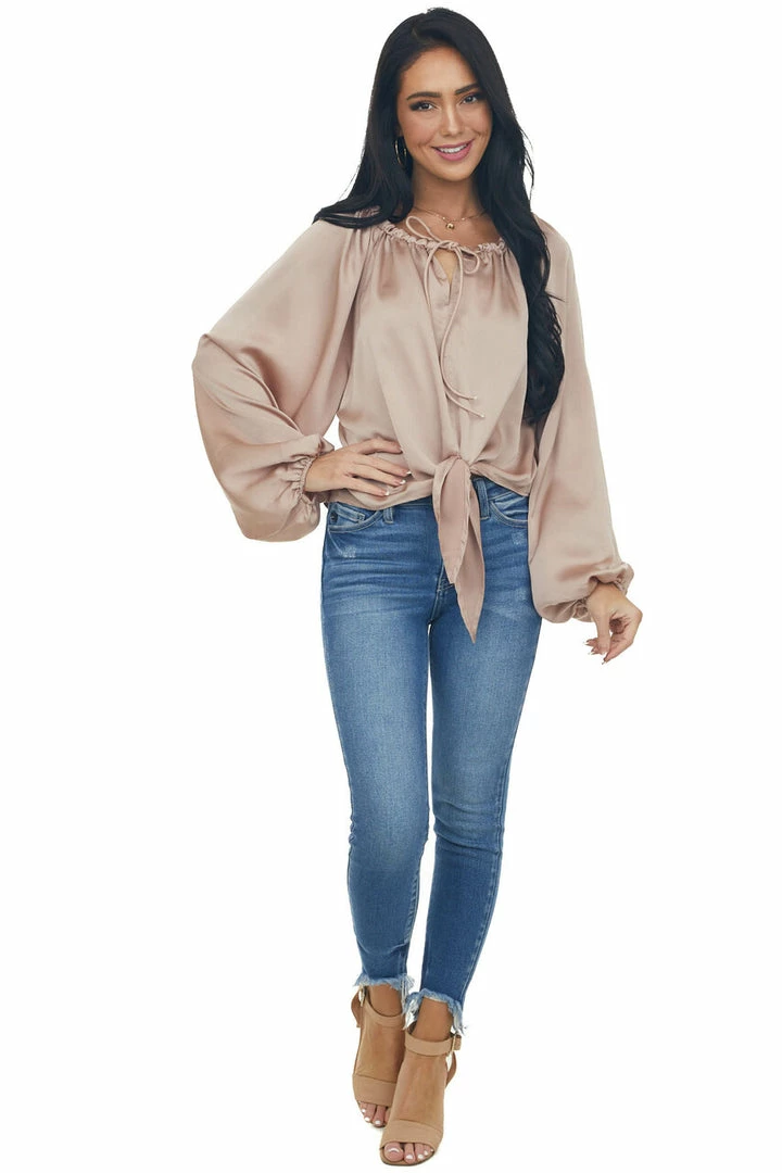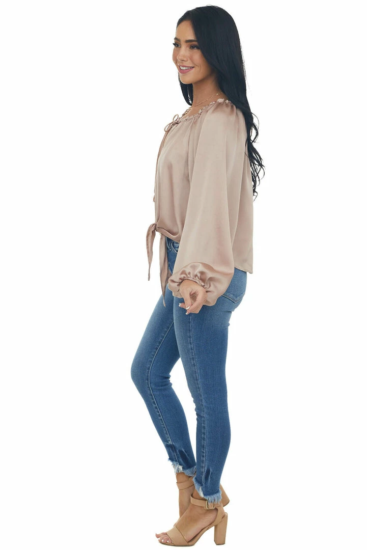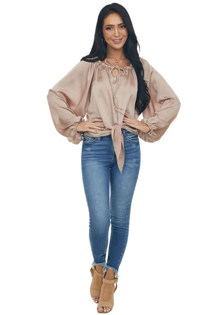 - Beige Notch Neck Front Tie Loose Satin Blouse