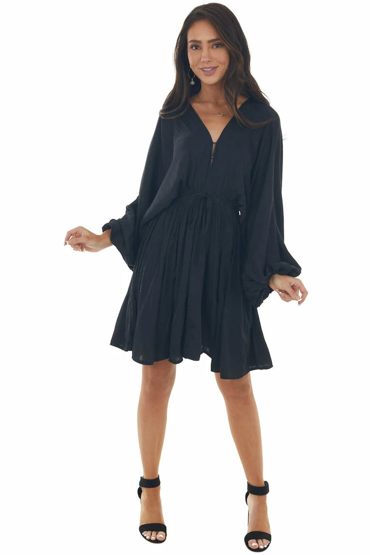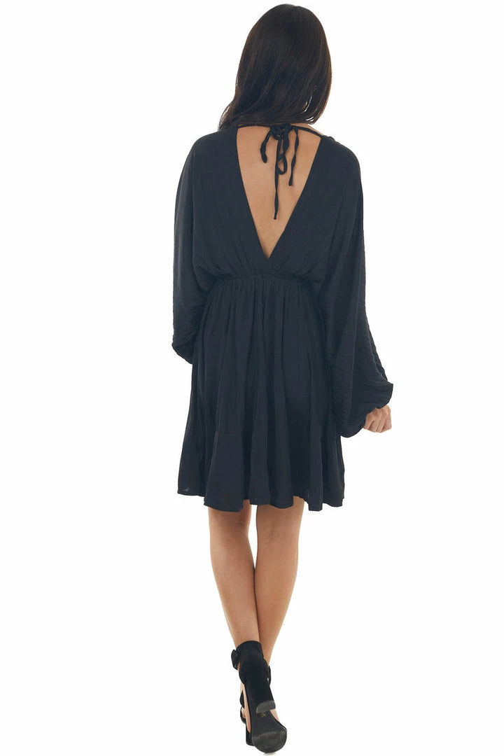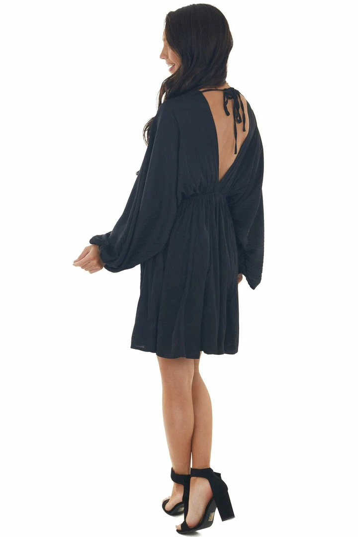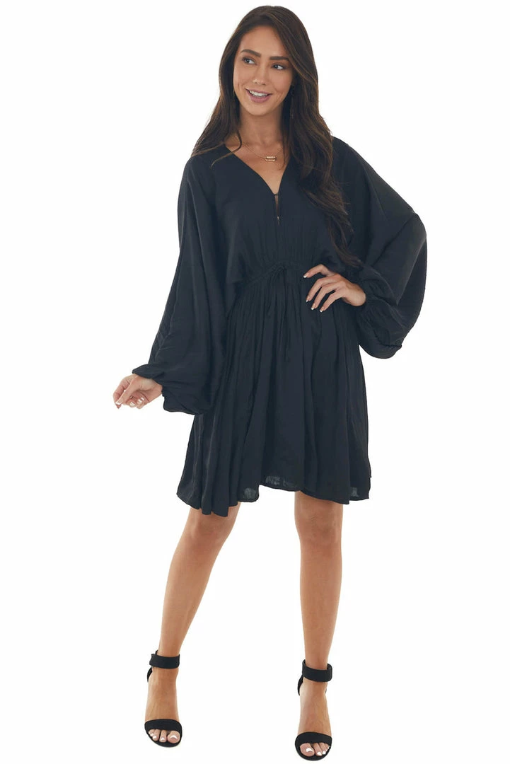 - Black Pleated Bubble Sleeve V Neck Short Dress