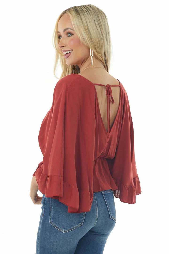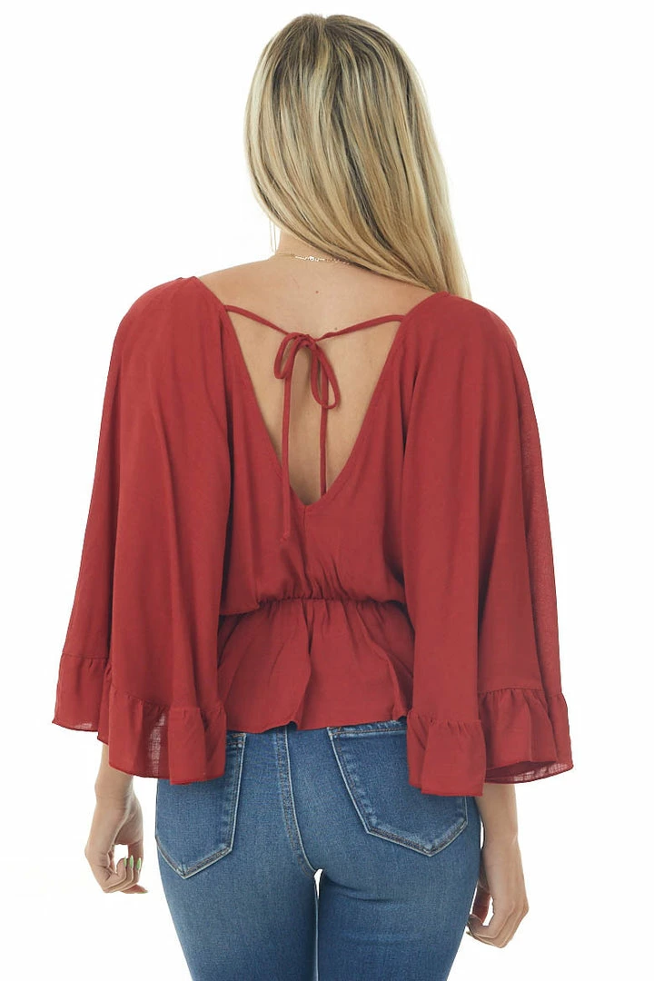 - Rust Surplice Flutter Sleeve Peplum Blouse