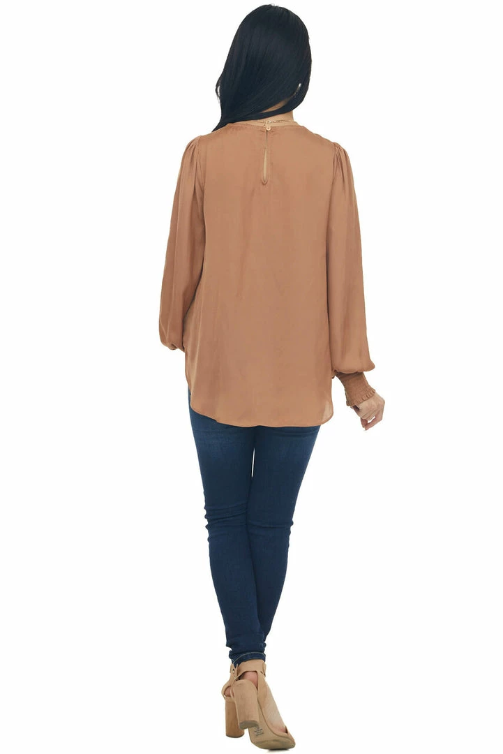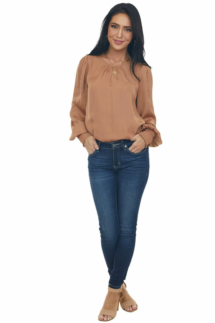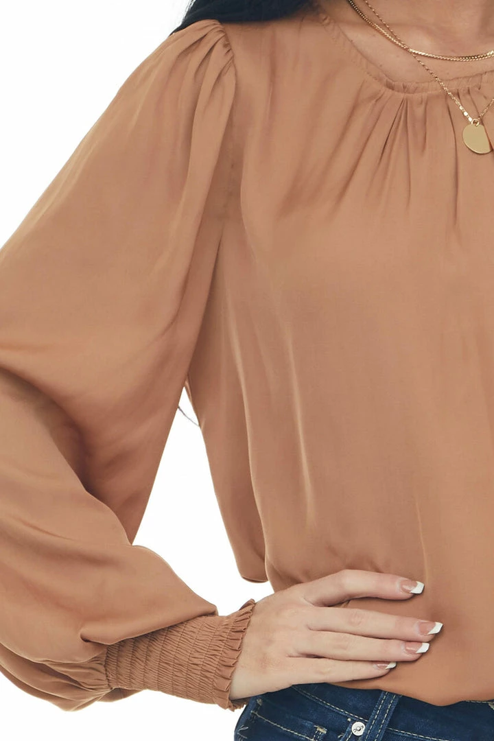 - Copper Silky Smocked Cuff Curved Hem Blouse