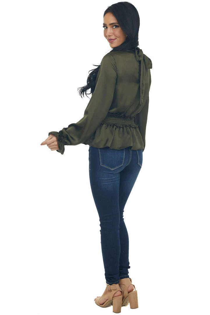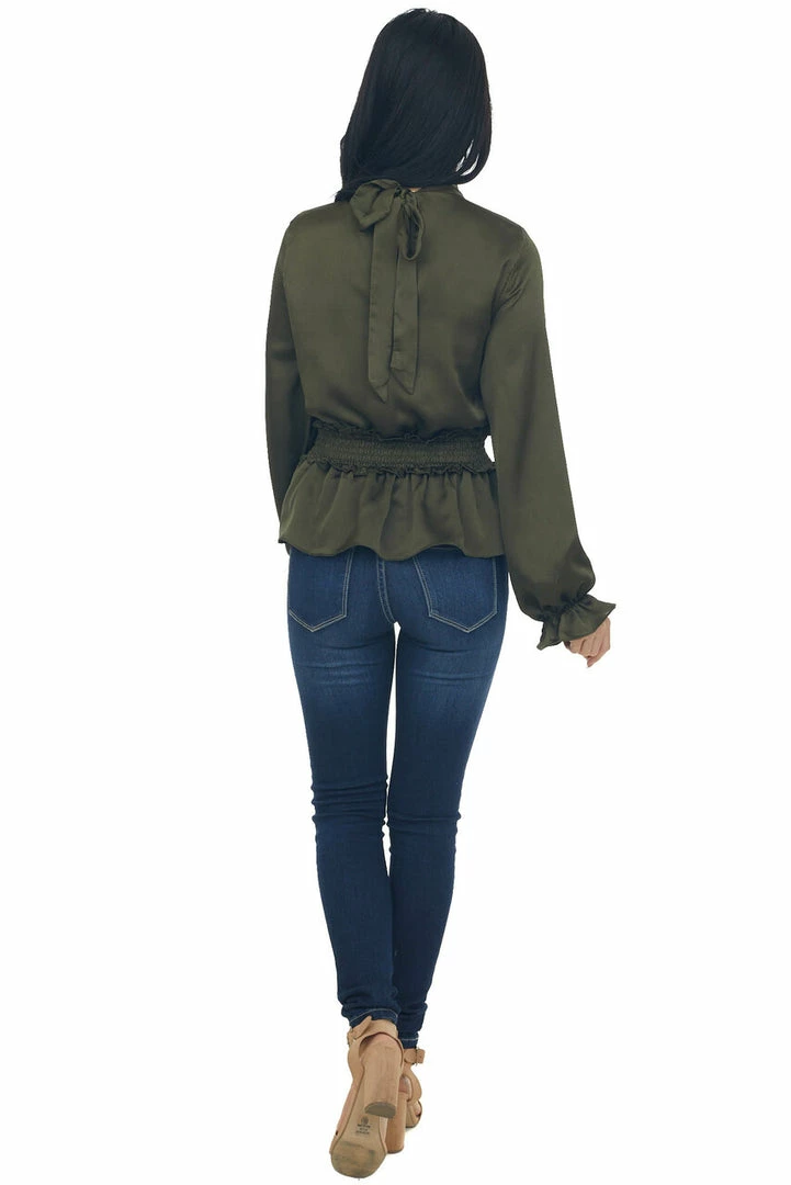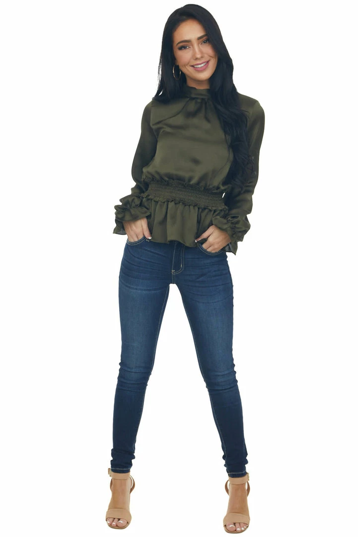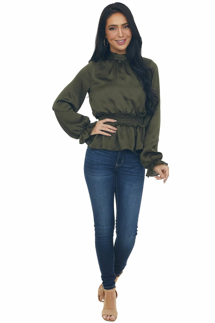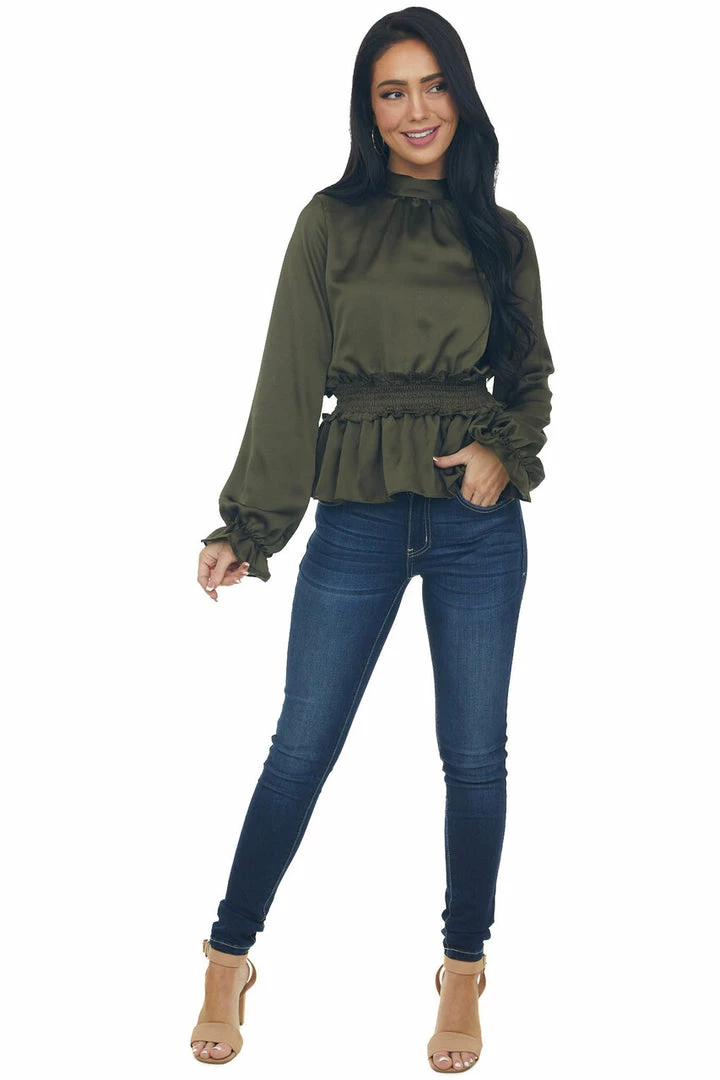 - Dark Army Green Mock Neck Smocked Peplum Top