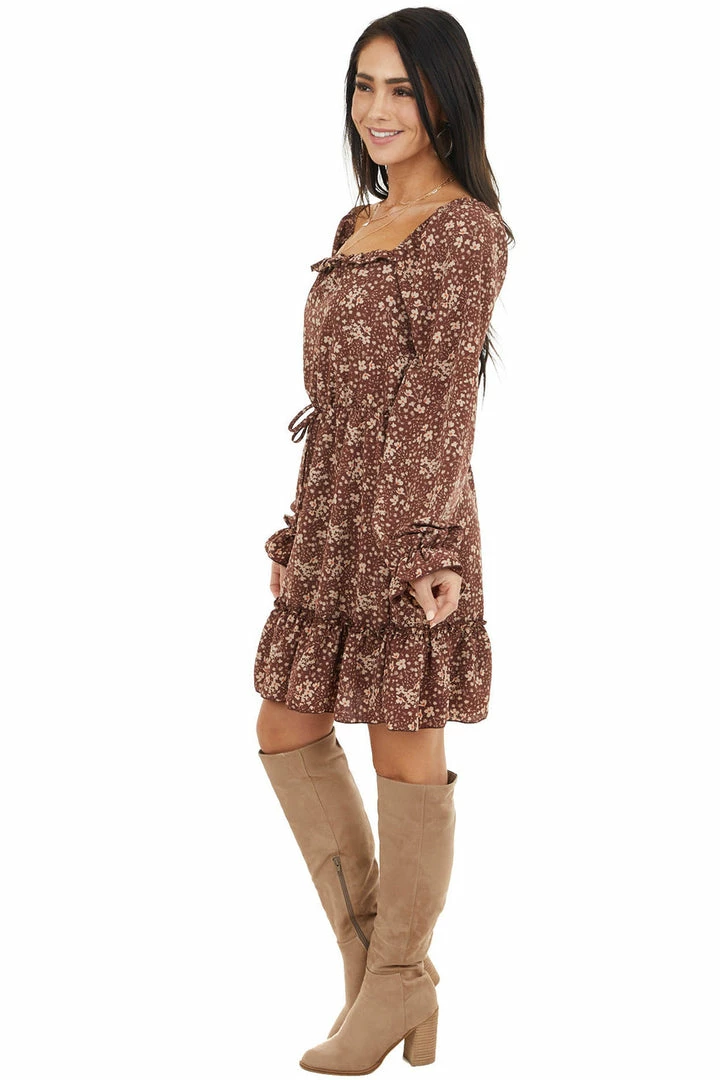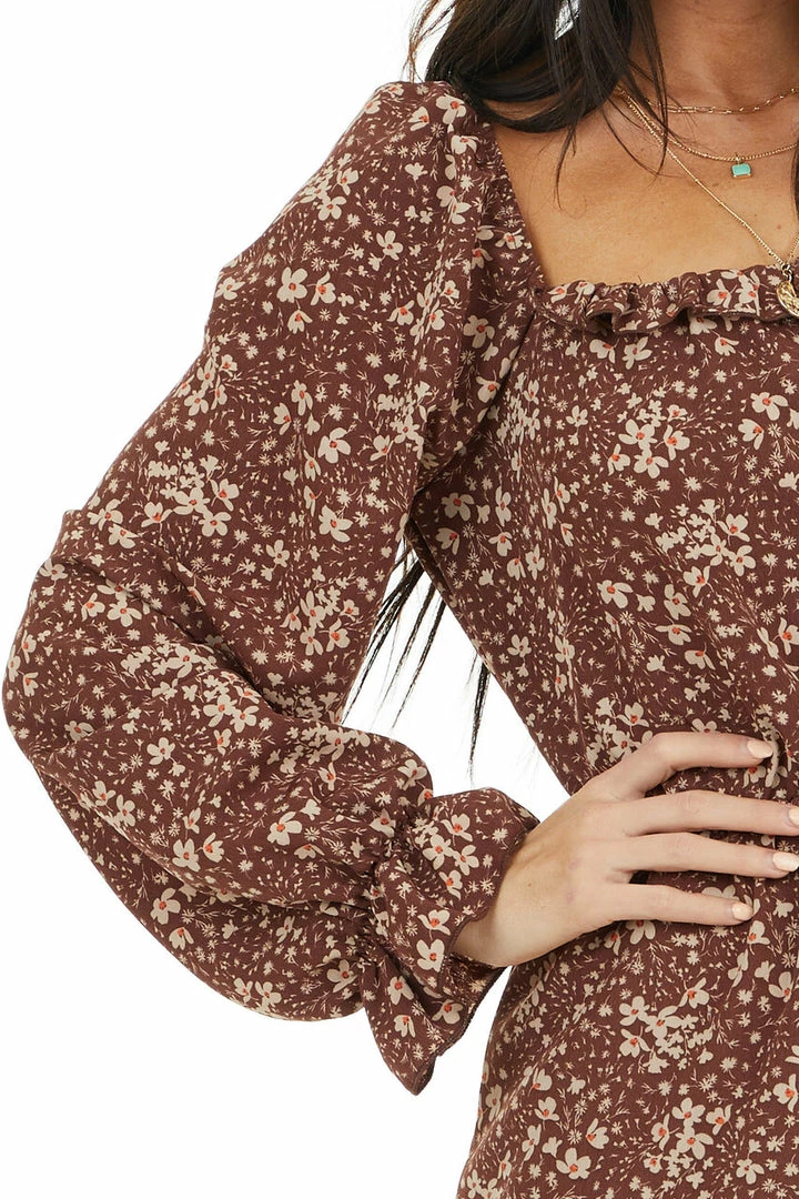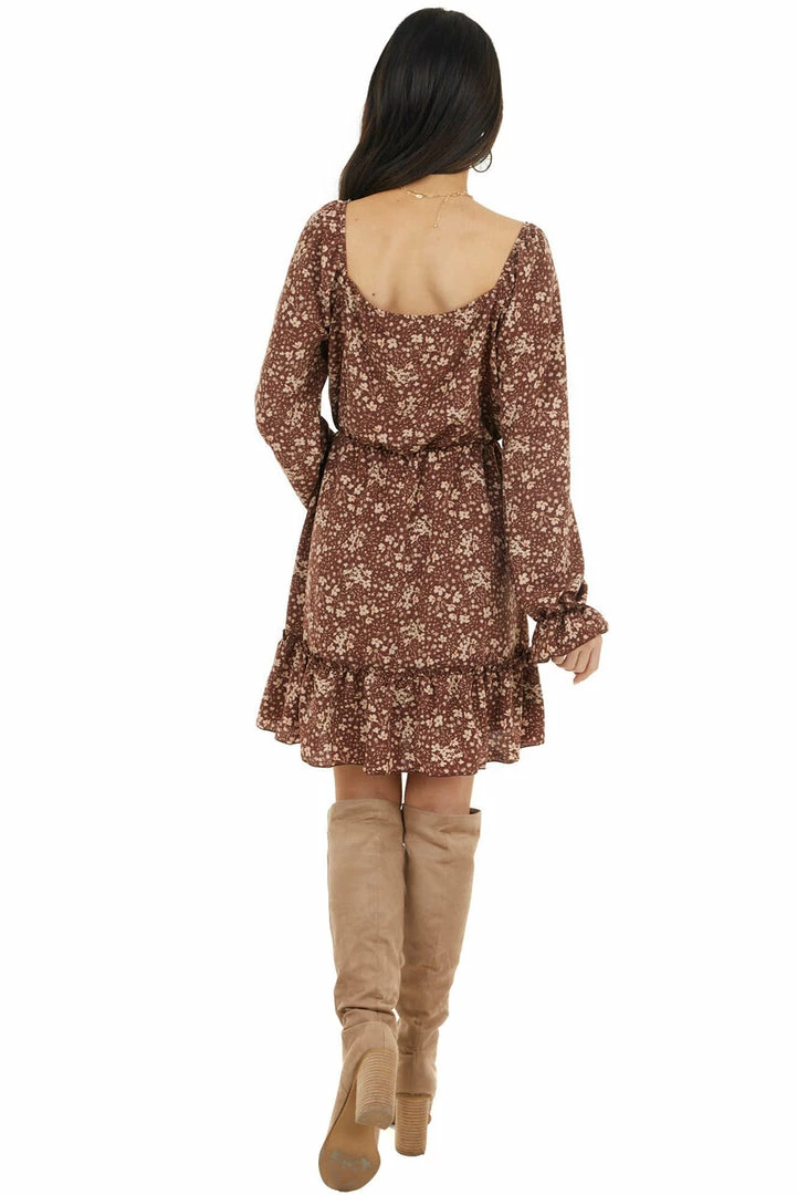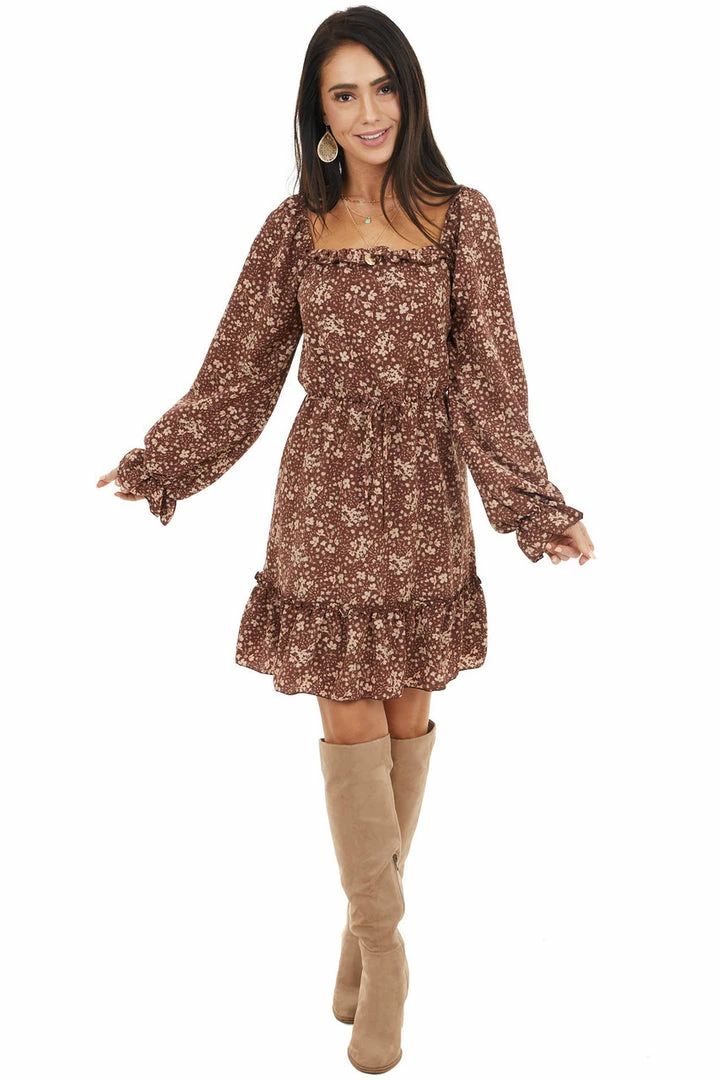- Chocolate Floral Print Long Sleeve Dress with Elastic Waist