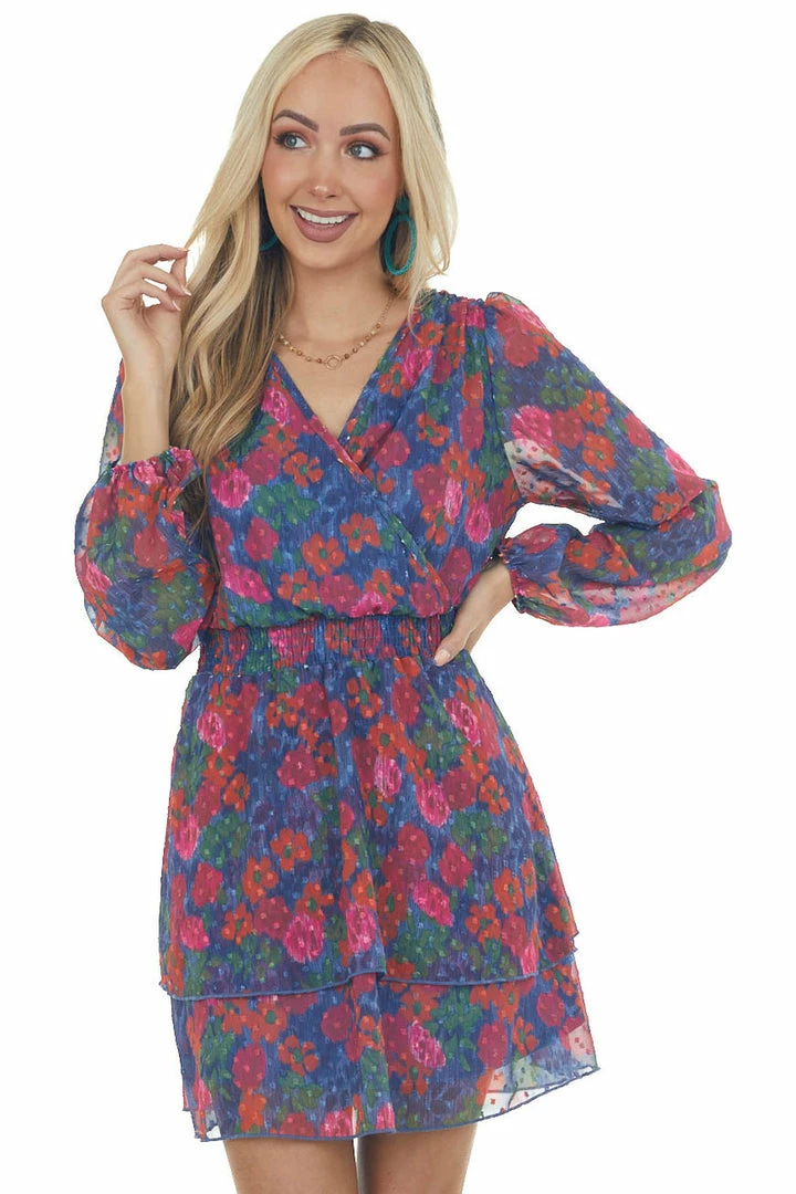 - Navy Abstract Floral Swiss Dot Surplice Dress