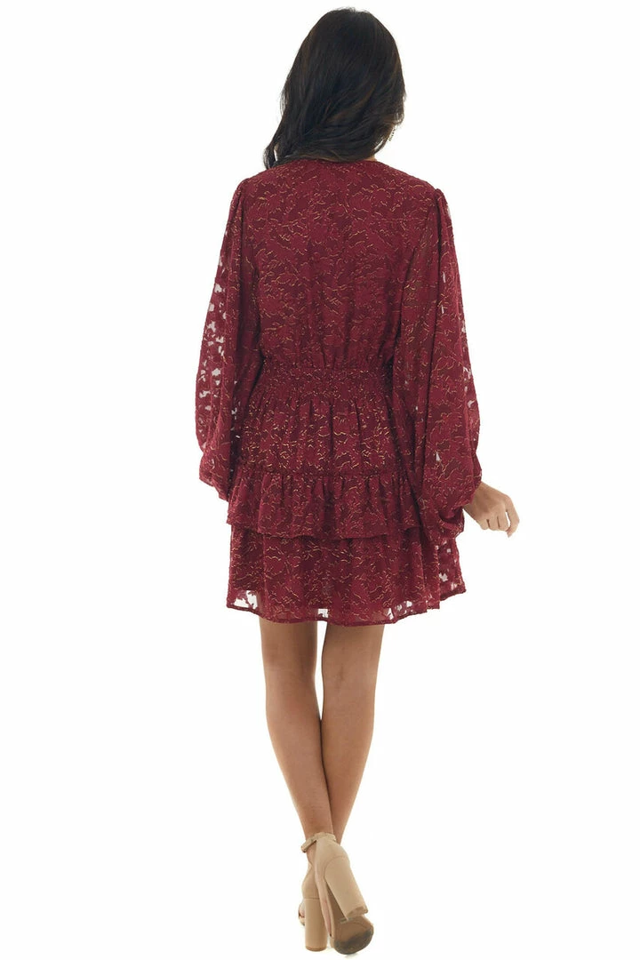 - Wine and Gold Metallic Texture Surplice Dress