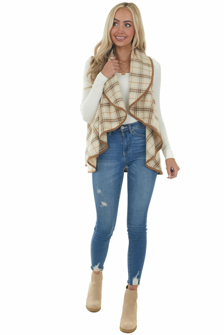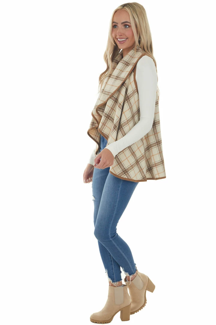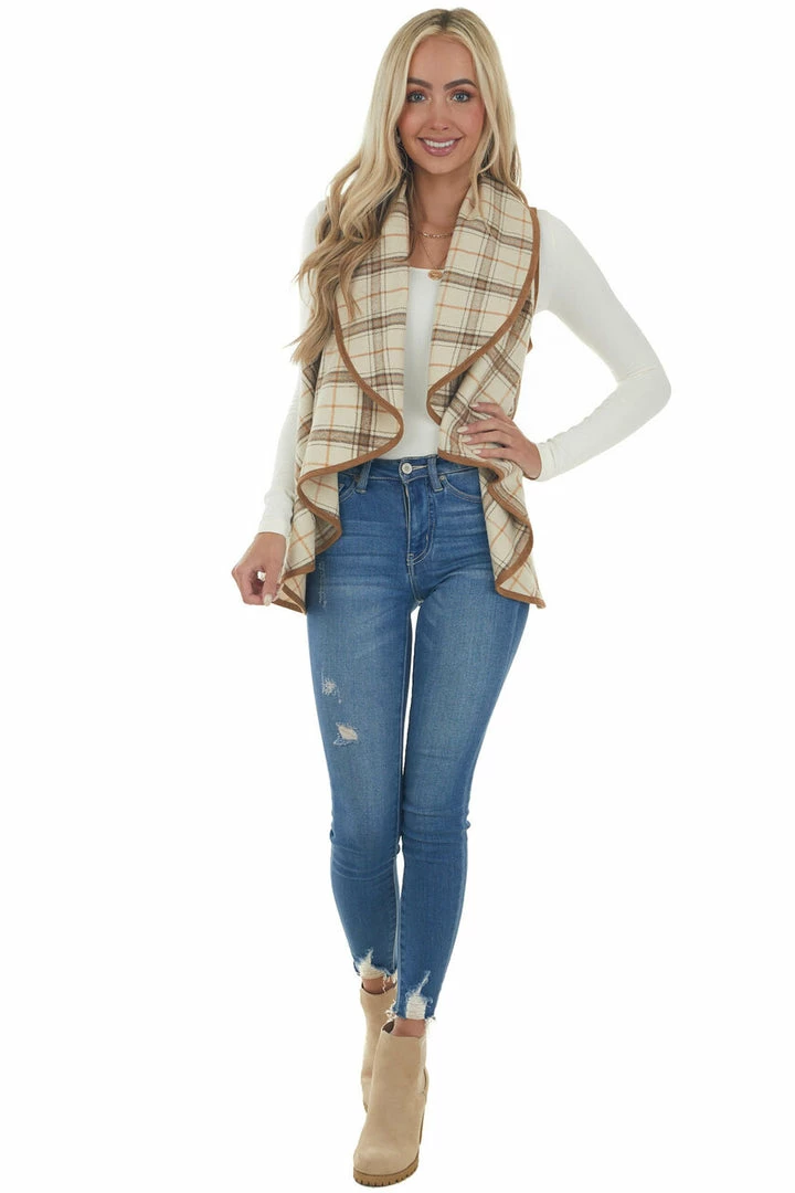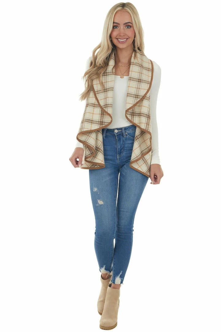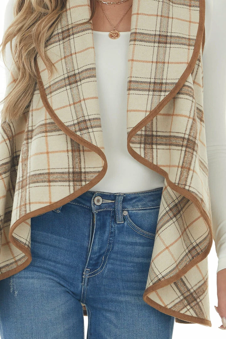 - Oatmeal and Camel Plaid Waterfall Open Front Vest